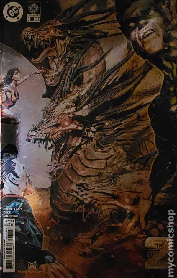 Limited 1 for 25 Retailer Incentive Variant Cover. Written by Brian Buccellato. Art by Christian Duce. Cover by Kevin Maguire. GODZILLA BRINGS THE BATTLE HOME! Superman and Lex Luthor form an uneasy alliance to combat the Hollow Earth's monstrous Great Apes. But for Superman, the real challenge isn't just the towering Titans--it's his waning powers and Luthor's ever-present treachery. Meanwhile, Wonder Woman and Batman wage their own battles against the Suicide Squad, edging closer to uncovering Task Force X's true plan for the creatures of G-Day Earth. And just when things seem insurmountable, Godzilla returns--this time, he's on his home turf. He's not just looking for a fight; he's here to defend his realm as King of the Monsters! 32 pages, full color. Rated T+ Cover price $5.99.