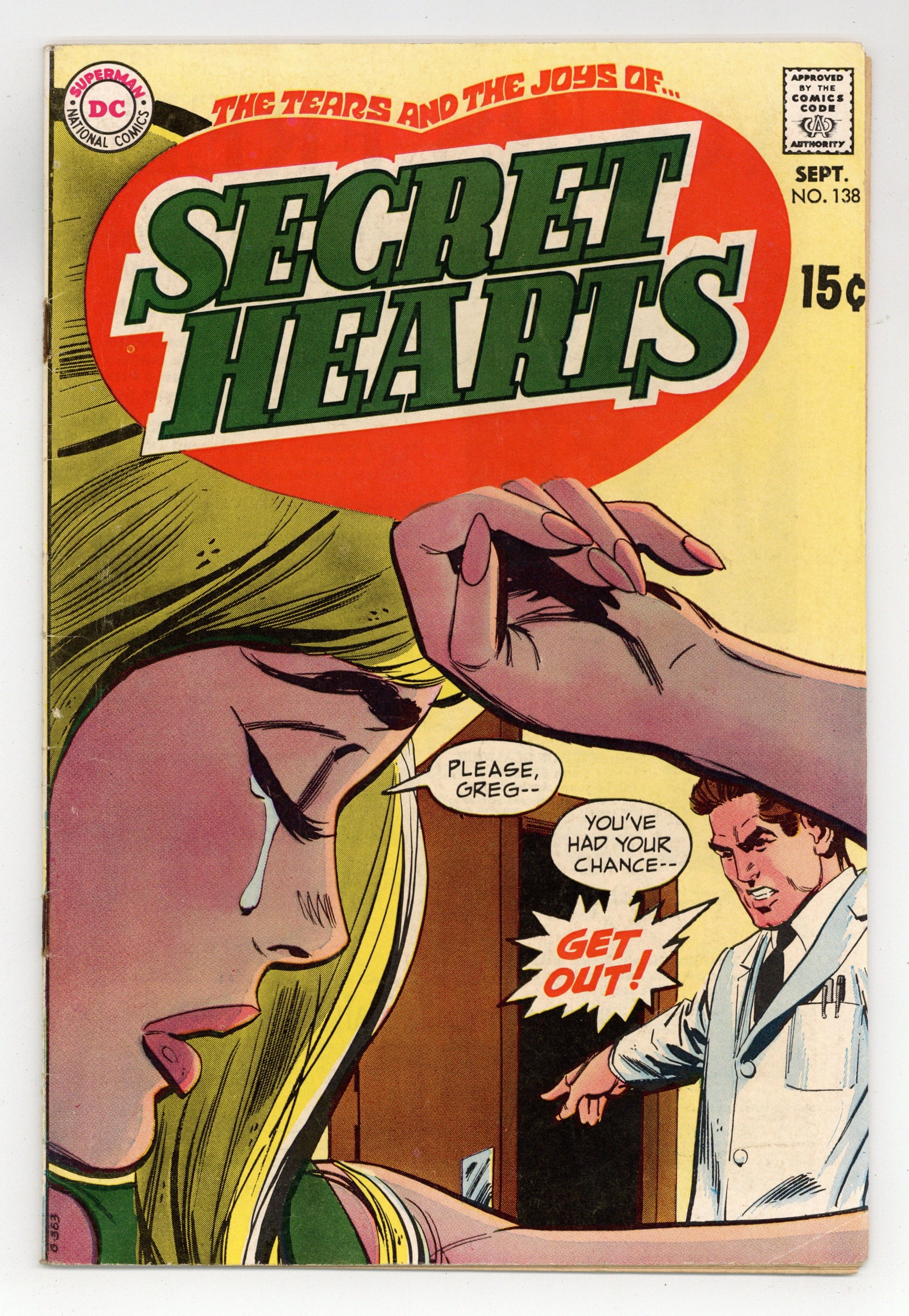 Cover art by Gene Colan. My Love is False!, pencils by Tony Abruzzo, inks by Frank Giacoia; Claire takes an unexpected trip to Mexico where she instantly falls in love with Carlos, but s chance discovery makes her doubt his sincerity. What Should I Tell My Heart?, pencils by Mike Sekowsky, inks by Bernard Sachs; Martha leaves her dependable boyfriend Carl for someone who's more exciting, but when things don't work out she runs back to Carl; However, he's already married to someone else. Ann Martin, Counselor-at-Love advice column. No Price Tag on Love!, script by Robert Kanigher, art by Gene Colan; Amy tries to help Alice, a poor girl who insists that a new, beautiful dress she has seen will change her life. 36 pgs. $0.12. Cover price $0.12.