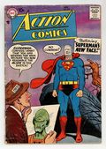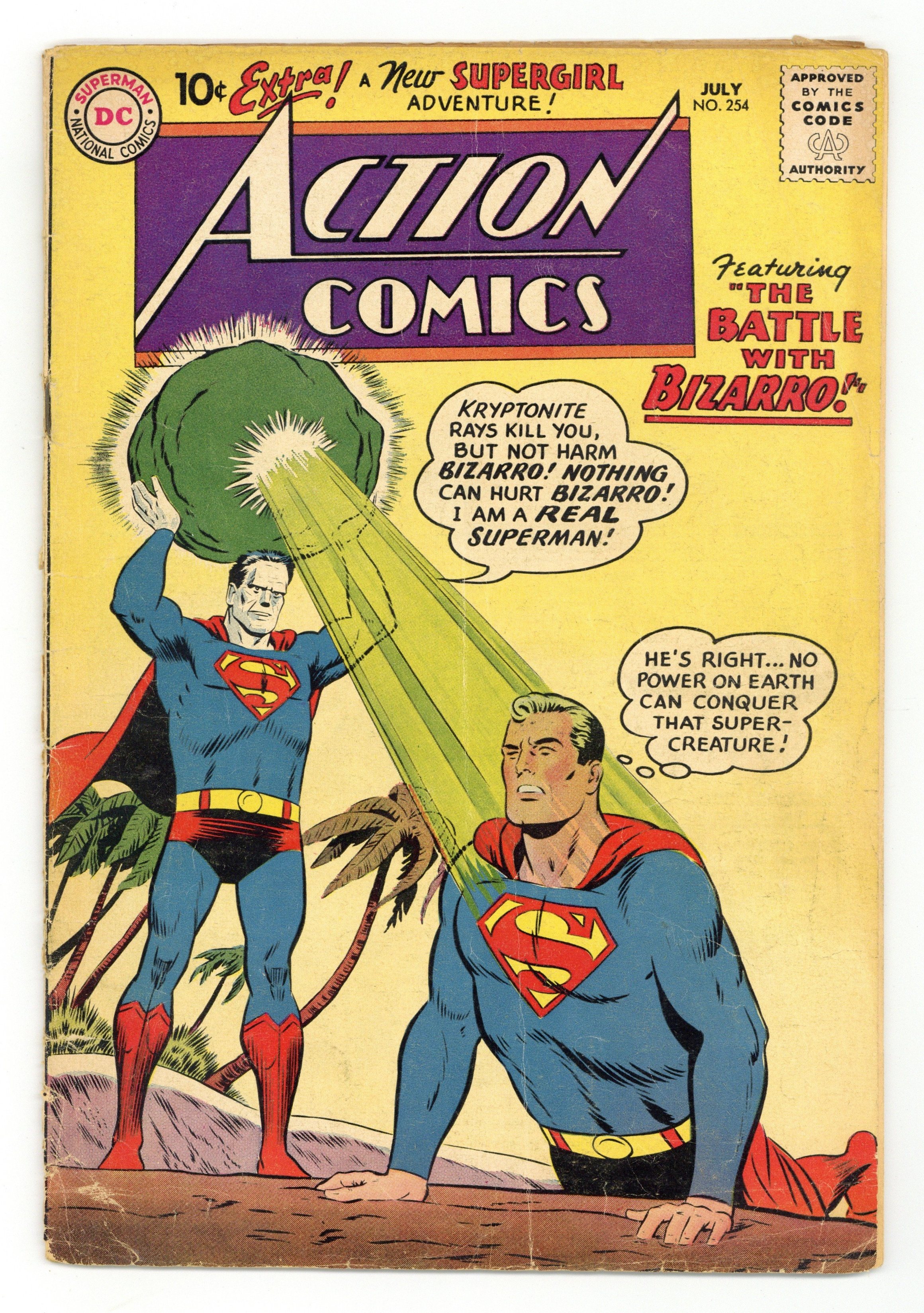 Cover pencils by Curt Swan, inks by Stan Kaye. "Superman's New Uniform," script by Otto Binder, pencils by Wayne Boring, inks by Stan Kaye; Lex Luthor disguises himself and approaches Superman; He tricks Superman into surrendering his costume to him for experimental purposes; As a substitute, he provides Superman with a bright yellow and purple replacement costume. The costume is fitted with an anti-Kryptonite belt; While Superman fights crime in his new costume, Luthor sheds his disguise and dons Superman's original red and blue garb. "The Man Who Talked to Animals" starring Congo Bill, art by Howard Sherman. "Space Chump #1," script by Otto Binder, art by Jim Mooney. 36 Pages, Full Color. $.10 Cover price $0.10.