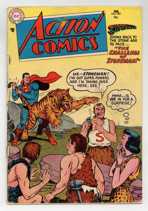 Last pre-comics code issue. Cover by Al Plastino. "The Challenge of Stoneman!", art by Al Plastino; An inventor's time machine takes him, Clark Kent, Lois Lane, Perry White, and a mobster to the distant past, where the crook assumes the identity of Stoneman and tries to control a tribe of cavemen. "The Great Jungle Baseball Game!" starring Congo Bill, art by Ed Smalle. Willie the Office Boy one-page story. Bebe one-page story by Henry Boltinoff. "Milkman in Space!" starring Tommy Tomorrow, art by Jim Mooney. 36 Pages, Full Color. $.10 Cover price $0.10.