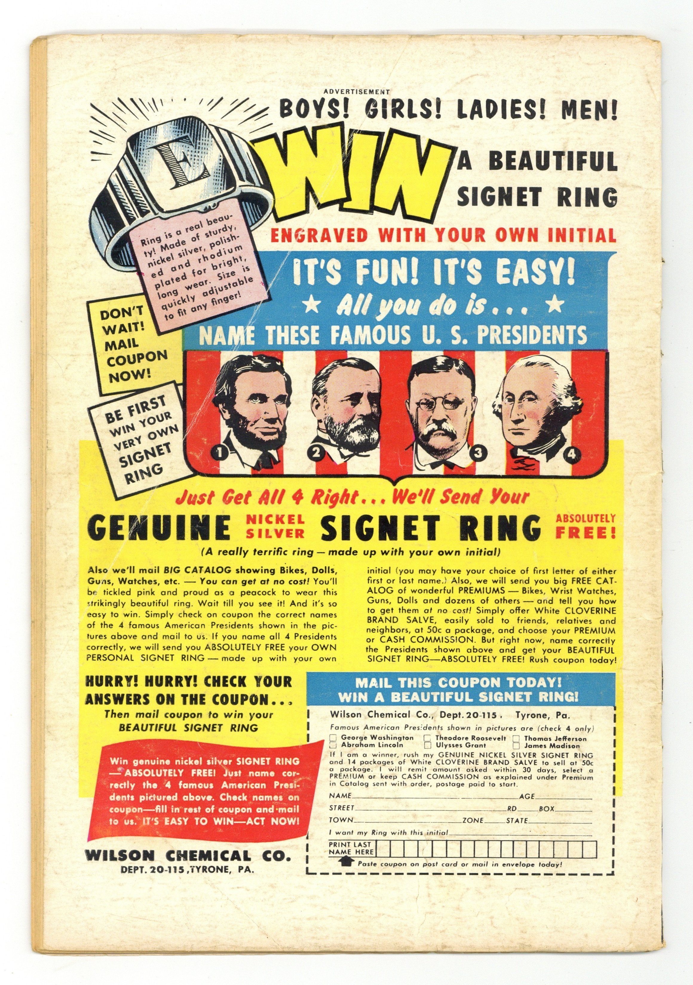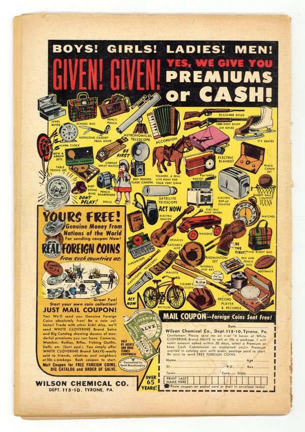 Cover art by Wayne Boring and Ray Burnley. The Return of Planet Krypton starring Superman, script by Bill Woolfolk, pencils by Wayne Boring, inks by Stan Kaye. The Quiz Game of Death starring Congo Bill, script by Jack Miller, art by Ed Smalle. The Jinx Planet starring Tommy Tomorrow, script by Otto Binder, art by Jim Mooney. The Amazing Crimes of the Lariat starring Vigilante, art by Bob Brown. 44 Pages, Full Color. $.10 Cover price $0.10.