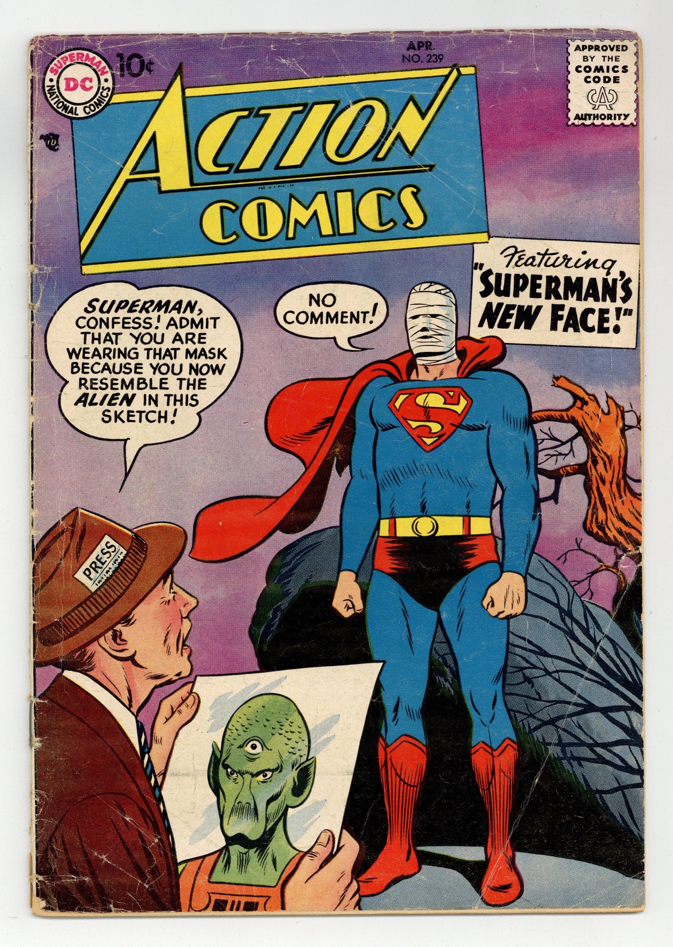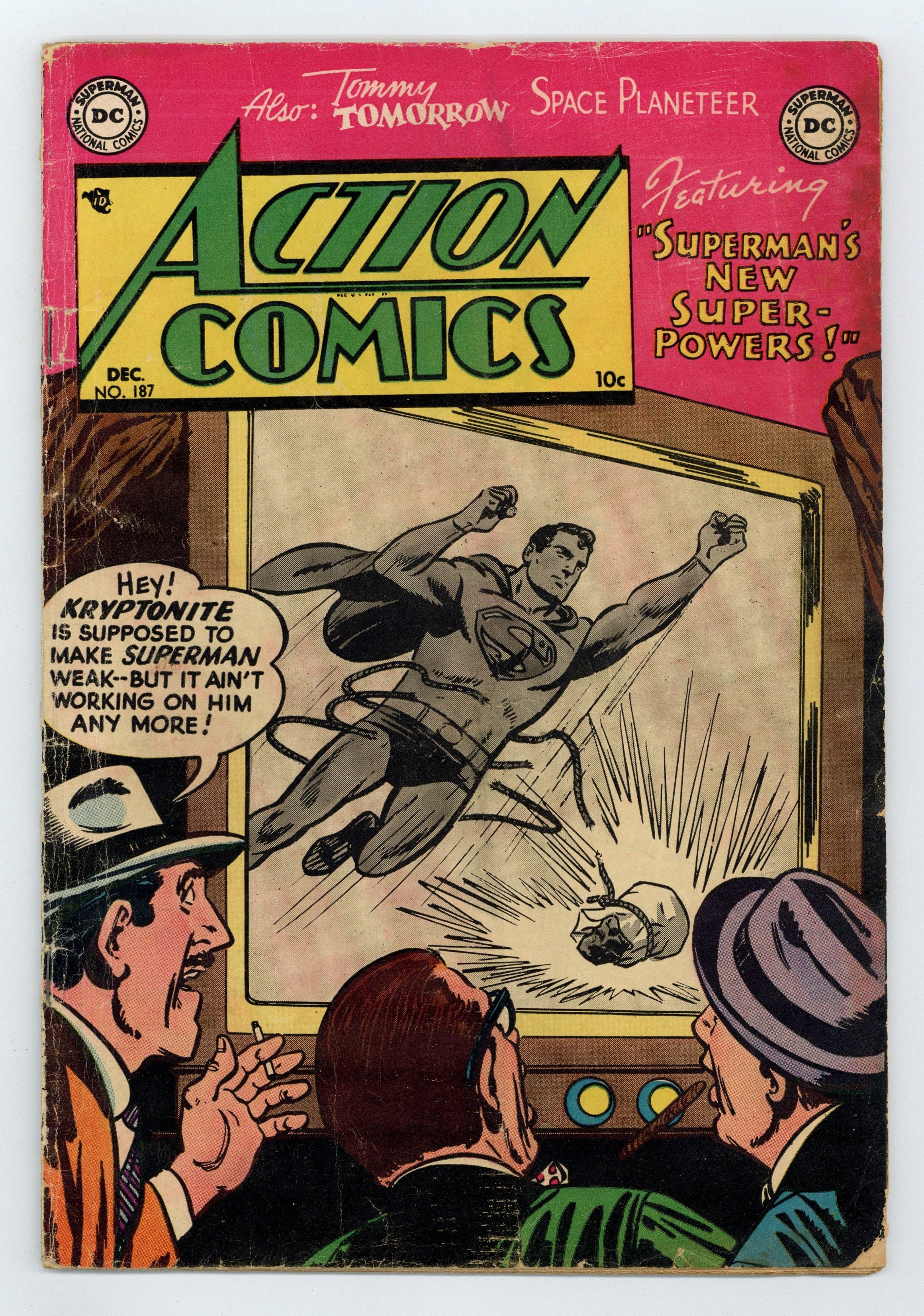 Cover pencils by Curt Swan, inks by Stan Kaye. "Superman's New Face," script by Edmond Hamilton, pencils by Wayne Boring, inks by Stan Kaye; Superman is caught in an atomic explosion and afterwards must bandage his face, or wear a lead mask, to keep anyone from seeing what happened to him. One-page Tricksy the World's Greatest Stunt Man story by Henry Boltinoff. "The Puzzle of the Jungle Pyramid!" starring Congo Bill, art by Howard Sherman. Untitled Jerry the Jitterbug story by Henry Boltinoff. Untitled Casey the Cop story by Henry Boltinoff. "The Toys That Stopped Space Crime" starring Tommy Tomorrow, script by Otto Binder, art by Jim Mooney. 36 Pages, Full Color. $.10 Cover price $0.10.