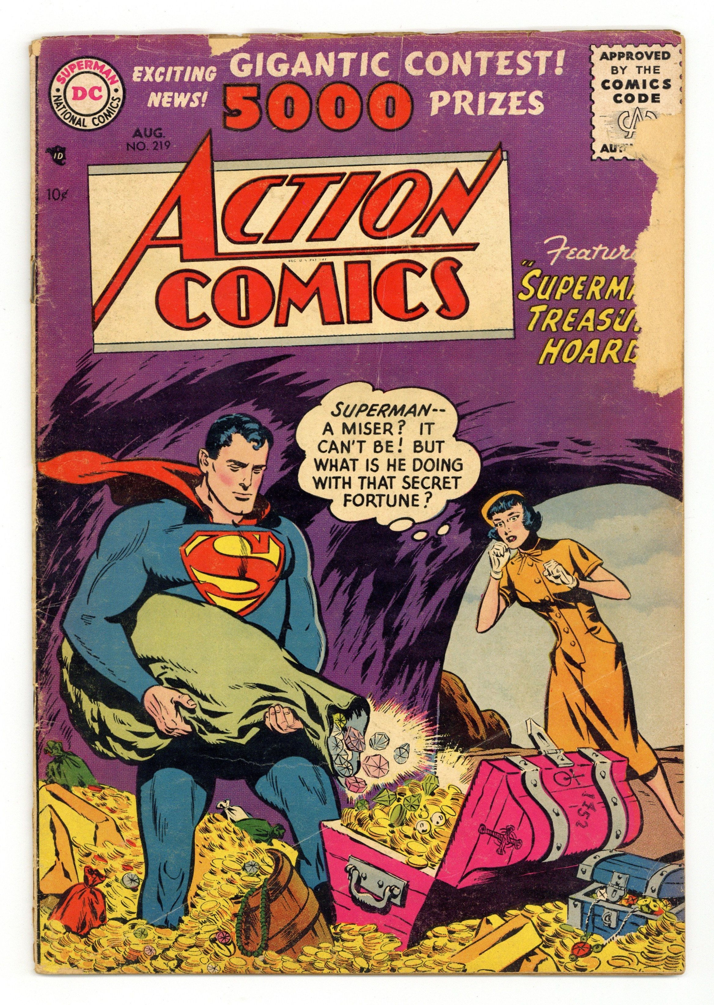 Cover pencils by Wayne Boring, inks by Stan Kaye. "Superman's Treasure Hoard," script by Bill Finger, pencils by Wayne Boring, inks by Stan Kaye; Superman is accumulating incredible wealth in a cavern of his own making, but no one seems to know the reason why. "The Amazing Army of Apes," script by Jack Miller, art by Ed Smalle; A military officer appears to go crazy and starts to think apes are his soldiers. 3/4–page Shorty story by Henry Boltinoff. "The Day I Beat the Baseball Jinx," script by Jack Miller (as Jack Mason), art by Raymond Perry. "Tom Thumb Tommy Tomorrow," script by Otto Binder, art by Jim Mooney. 36 Pages, Full Color. $.10 Cover price $0.10.
