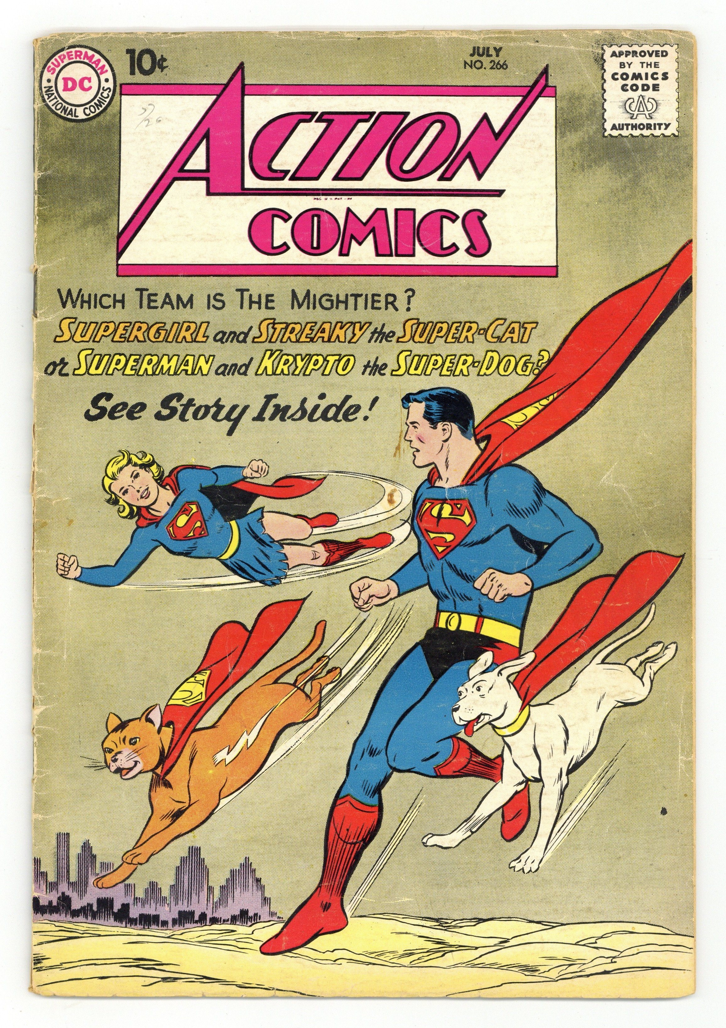 Cover art by Win Mortimer. Welcome, Amigo public service announcement starring Binky, script by Jack Schiff, art by Bob Oksner. The Man Who Sped Up Superman, pencils by Wayne Boring, inks by Stan Kaye. Bad Boys of the Jungle starring Congo Bill, art by Ed Smalle. The Singing Spaceman starring Tommy Tomorrow, art by Jim Mooney. The Red Dust Bandit starring Vigilante, script by Dick Wood, art by Howard Sherman. 44 Pages, Full Color. $.10 Cover price $0.10.