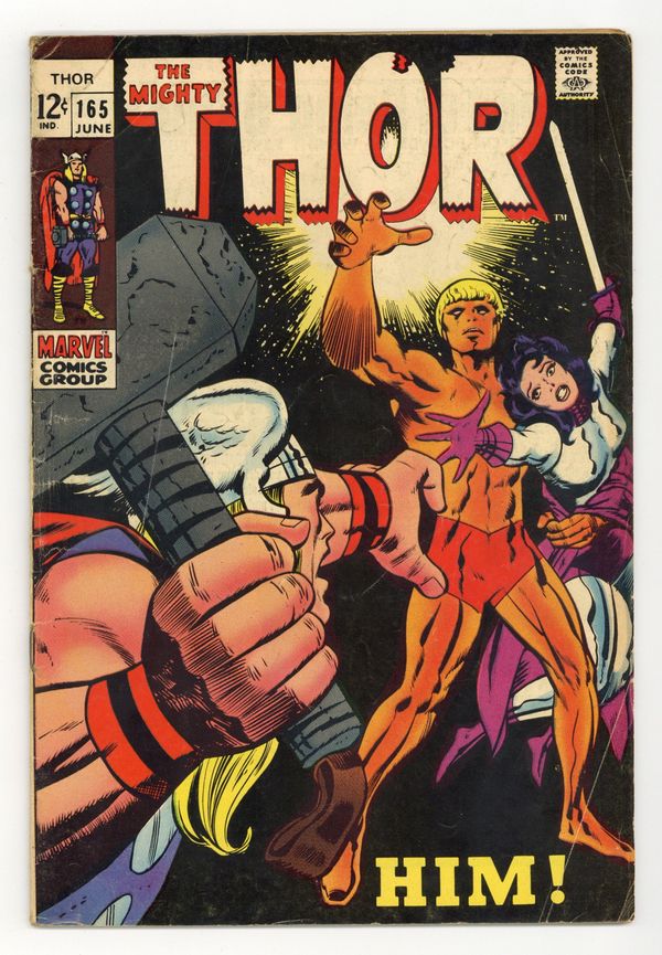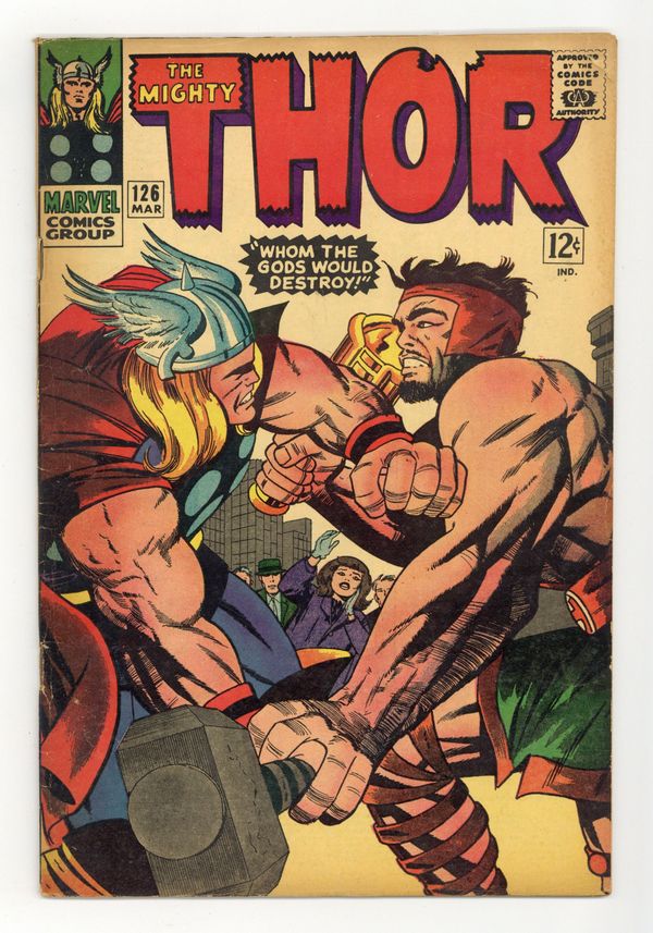 Title becomes Thor; previously Journey Into Mystery. Cover pencils by Jack Kirby, inks by Vince Colletta. "Whom the Gods Would Destroy!", script by Stan Lee, pencils by Jack Kirby, inks by Vince Colletta; Thor and Hercules fight over Jane Foster; Odin, still angry because Thor revealed his identity to Jane, removes half Thor's powers by giving 'Odin Power' to Seidring. Hercules defeats Thor. Marvel Bullpen Bulletins. Tale of Asgard: "The Summons!", script by Stan Lee, pencils by Jack Kirby, inks by Vince Colletta; The Argonauts are called home to Asgard by Odin. Appearances by Balder, Hogun, Fandral, Volstagg, and Odin. The letters page contains a statement of ownership, management and circulation: average print run 377,663; average paid circulation 232,644. 36 pgs., full color. $0.12. Cover price $0.12.