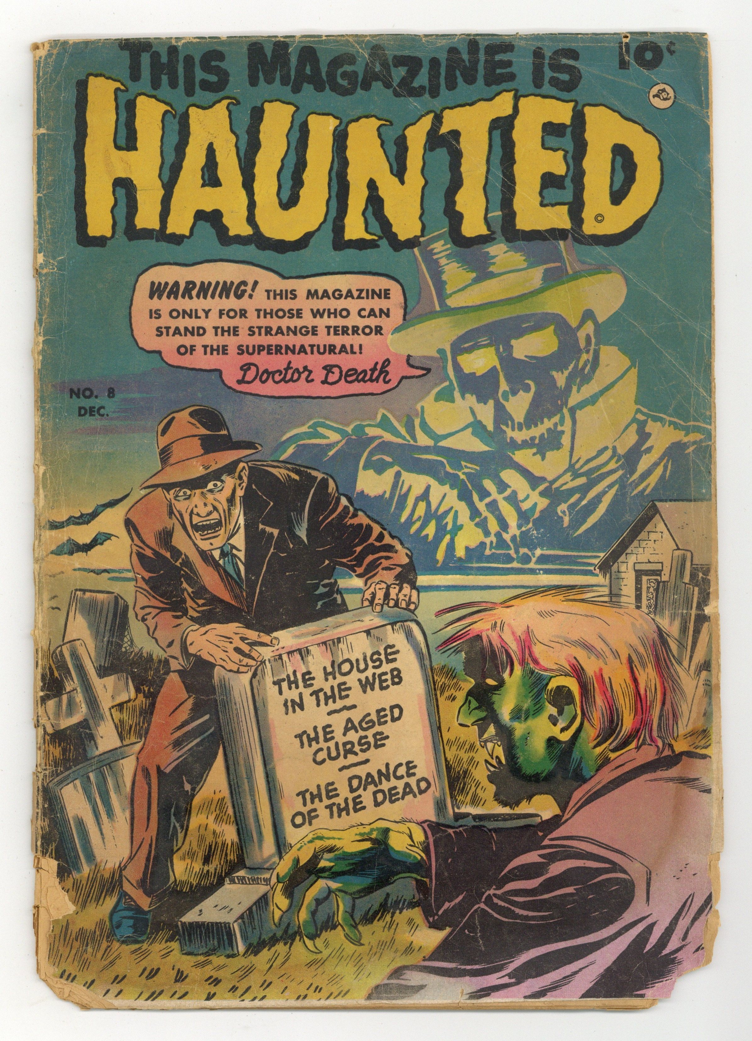 Edited by Will Lieberson, V.A. Provisiero and Al Jetter. Cover by Shelly Moldoff. Stories by unknown. Art by Bob McCarty, Shelly Moldoff and unknown. Warning! This magazine is only for those who can stand the strange terror of the supernatural! Horror tales that are so scary they could only lead you to believe that This Magazine is Haunted! In this issue: The satanic supernatural Mr. Avarice makes pacts with humans willing to let their life be fueled by greed in "The House in the Web" with art by Bob McCarty. Plus: Headmaster Lowry runs a cruel regime in his old people's home. Father Time in person puts him to the test by letting him age rapidly. Lowry has to experience the curse of old age first-hand in "The Aged Curse!" And: A beautiful dancer named Tanya is being kidnapped into another dimension by three carcass-like fiends. The power of dance, however, is too much for these ghouls, and Tanya dances right back into the arms of her earthly lover in "The Dance of the Dead!" with art by Shelly Moldoff. Also: 2-page text story "Lost Chords" written by John Martin, and ads for Strange Suspense Stories and Terror Tales. 36 Pages, Full Color. Cover price $0.10.