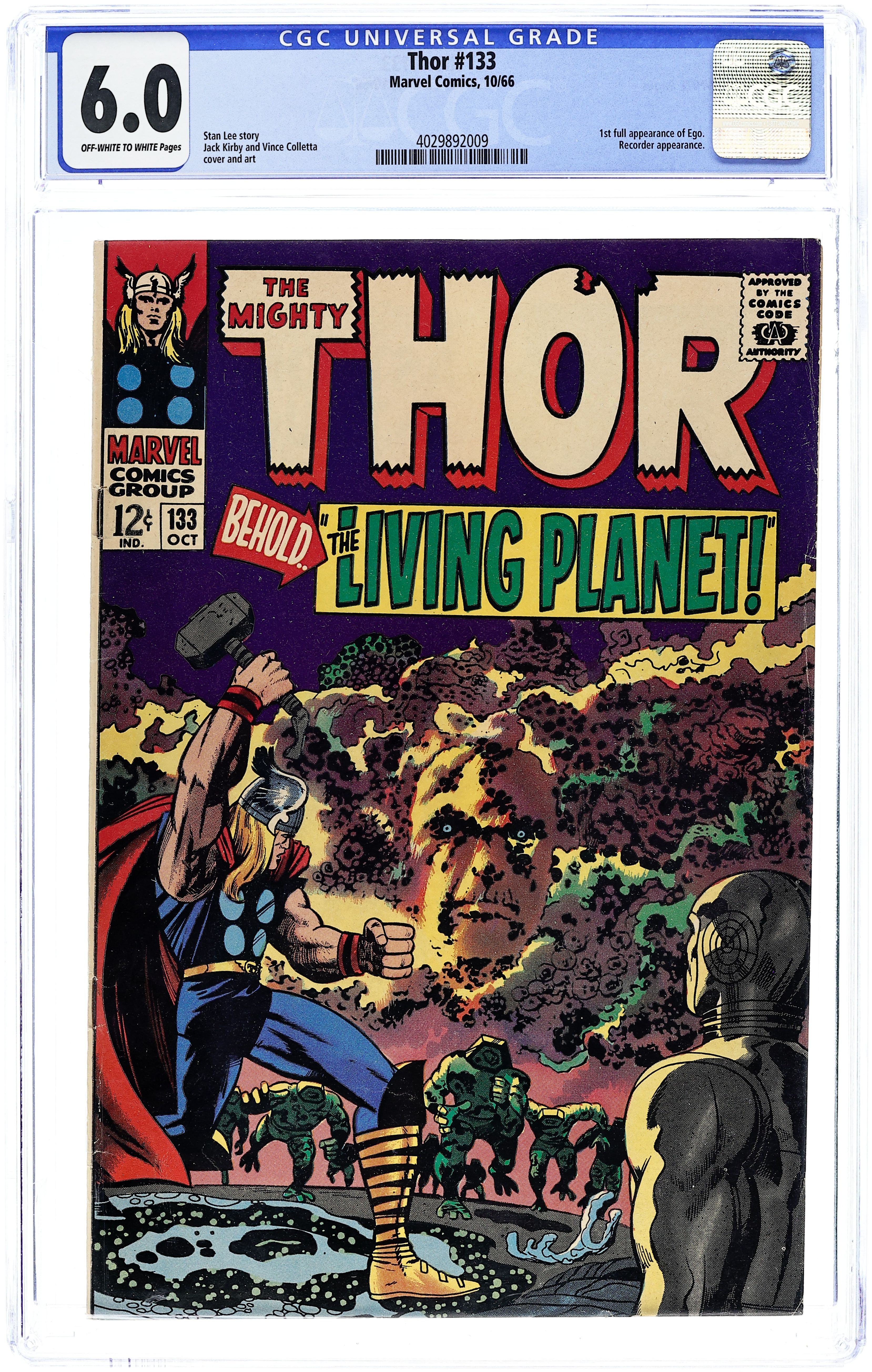 Cover pencils by Jack Kirby, inks by Vince Colletta. Ego and the Recorder guest star in "Behold...The Living Planet!", script by Stan Lee, pencils by Jack Kirby, inks by Vince Colletta; Thor wins over Ego, the Living Planet and gets Earth's freedom from the colonizers; Jane wanders into the New Men and is offered a job as a teacher in Wundagore. Bullpen Bulletins. Tale of Asgard: "Valhalla!", script by Stan Lee, pencils by Jack Kirby, inks by Vince Colletta; Harokin rides the Black Stallion of Doom to Valhalla. 36 pgs., full color. $0.12. Cover price $0.12.