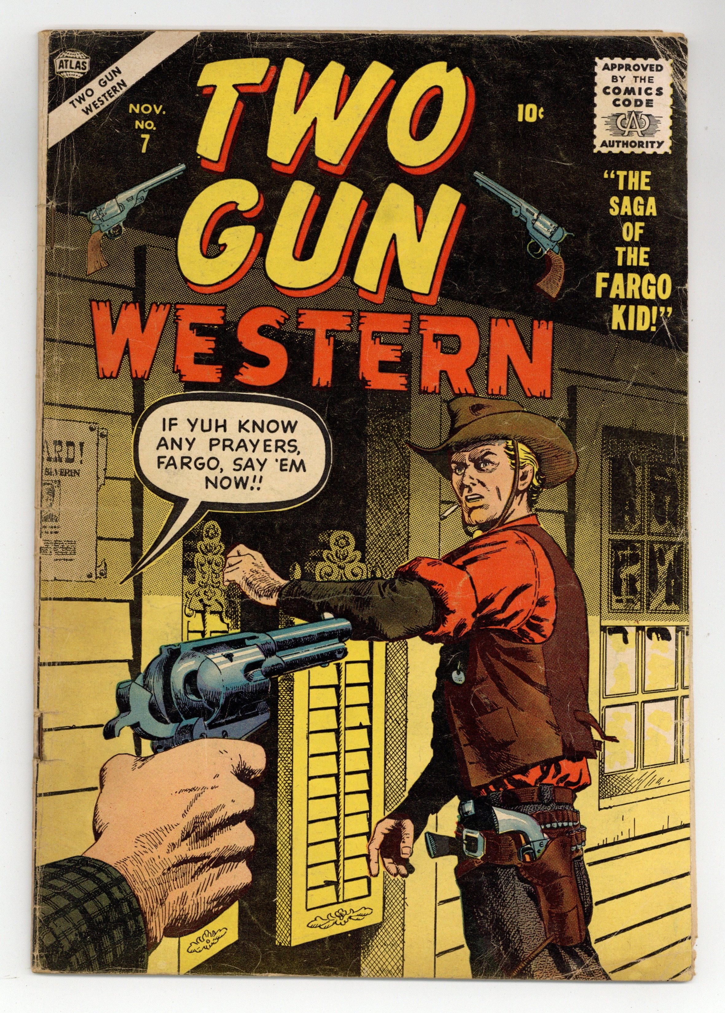 Cover by John Severin. "The Fastest Gun!", art by Chuck Miller; Riding into town, the Two-Gun Kid comes to the aid of Charlie "Bobo" Colby, a mentally challenged boy who is being bullied by the locals. "Lost Ghost Town" text story. Untitled story, art by Chuck Miller; Taking up a job as an undercover trouble shooter for a railroad company, the Two-Gun Kid goes to investigate trouble in the town of Trail's End, purposely provoking a fist fight to see what he can learn by acting tough to attract the leader of an outlaw gang that has been affecting production. Untitled story, art by Chuck Miller; The Two-Gun Kid and his friend Jim Stack have just finished a job delivering cattle to a waterfront town; their arrival is not the best as the cattle sale is not enough to share Jim's ranch. "Waters of Doom!", art by Chuck Miller; The Two-Gun Kid has come to the aid of Boonetown to help defend it from a war party of Sioux warriors, despite a peace treaty on the promise that the people of Boonetown would not hunt on the Sioux grounds. 36 pgs., full color. $0.10. Cover price $0.10.