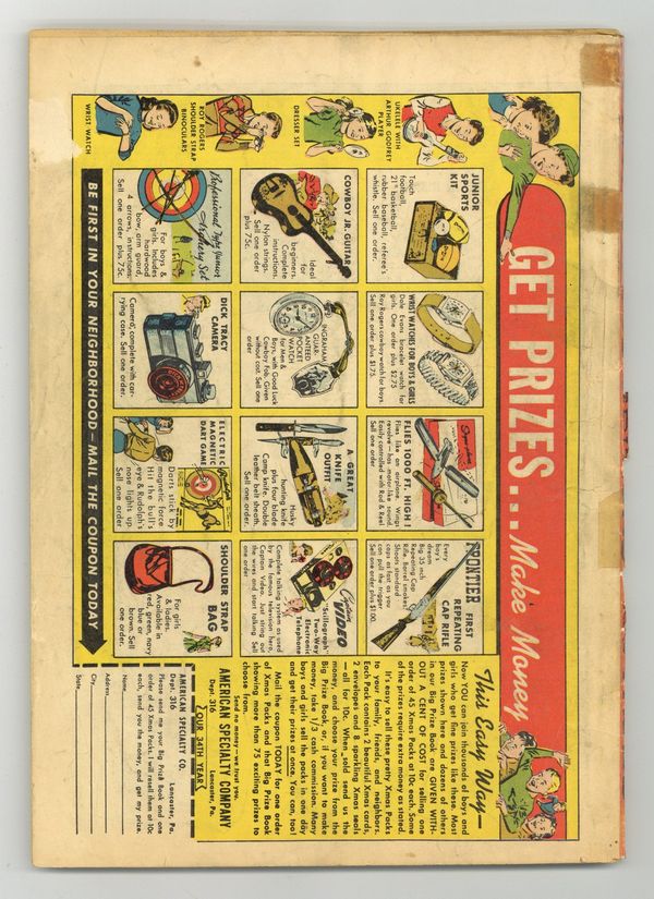 Written by Gardner F. Fox. Art and cover by Everett E. Hibbard. Flash meets Winky, Blinky and Noddy while visiting the Cumberly Horse Farm with Joan. Joan's friend Trudy owns a horse named "Short Shanks", a very fast horse that shows little promise of racing fame...until a mysterious fire and sale of the horse at public auction. Butch McLobster story by Ed Wheelan. Hop Harrigan text story by Evelyn Gaines. 68 Pages, Full Color. Cover price $0.10.