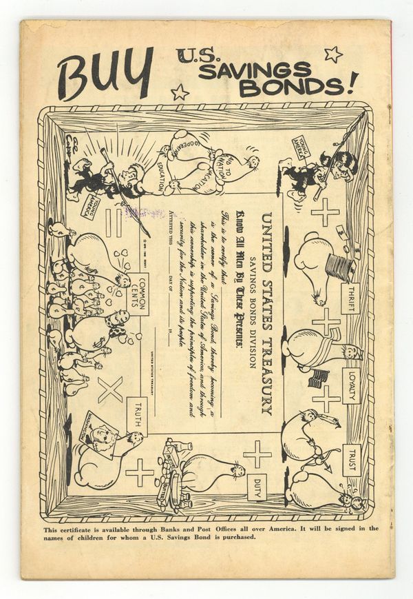 Cover art by Irwin Hasen. The Perfect Crime, script by Bill Finger, pencils by Irwin Hasen, inks by Harry Tschida; After Green Lantern is cauight red-handed at the scene of a crime, an APEX broadcaster begins a personal vendetta against the Emerald Crusader, charging him with being a master criminal! The Night Has a Thousand Eyes starring Dr. Mid-Nite, script by Charles Reizenstein, art by Stan Aschmeier. U.S. Savings Bonds public service announcement starring Green Lantern, art by Irwin Hasen. Gunnery Training Camp starring Hop Harrigan, script and art by Jon L. Blummer. The Missing Tycoons starring Sargon the Sorcerer, script by John B. Wentworth, art by Howard Purcell. Dinky Joins the Boy Scouts starring Scribbly and the Red Tornado, script and art by Sheldon Mayer. The Hungry Horse starring The Atom, script by Ted Udall, art by Joe Gallagher. Sabotage! starring Red, White and Blue, script by Ted Udal, art by Joe Gallagher. Mutt and Jeff strips by Al Smith (as Bud Fisher). 68 pgs. $0.10. Cover price $0.10.