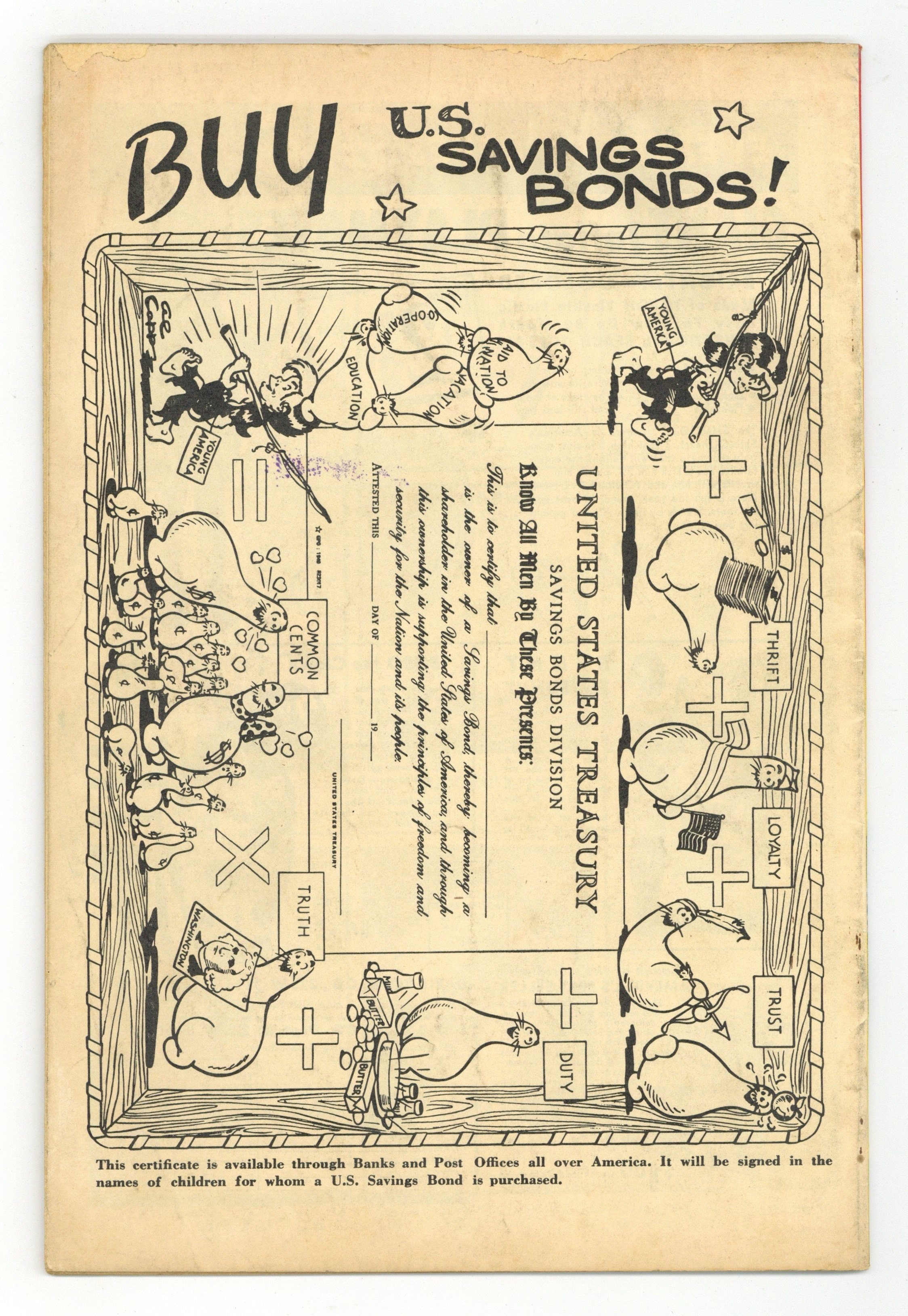 Stories by unknown. Art by unknown. America's greatest comic characters! Featuring: untitled Gandy and Sourpuss story; untitled Silly Seal and Ziggy Pig story; untitled Super Rabbit story; untitled Tommy Cat story; untitled Widjit Witch and Her Broom, 'Diogenes' story; untitled The Three Rabbiteers story; and Toughy Tomcat & Chester Chipmunk in "Bank Robber Billy"! 56 pages, full color. Cover price $0.10.