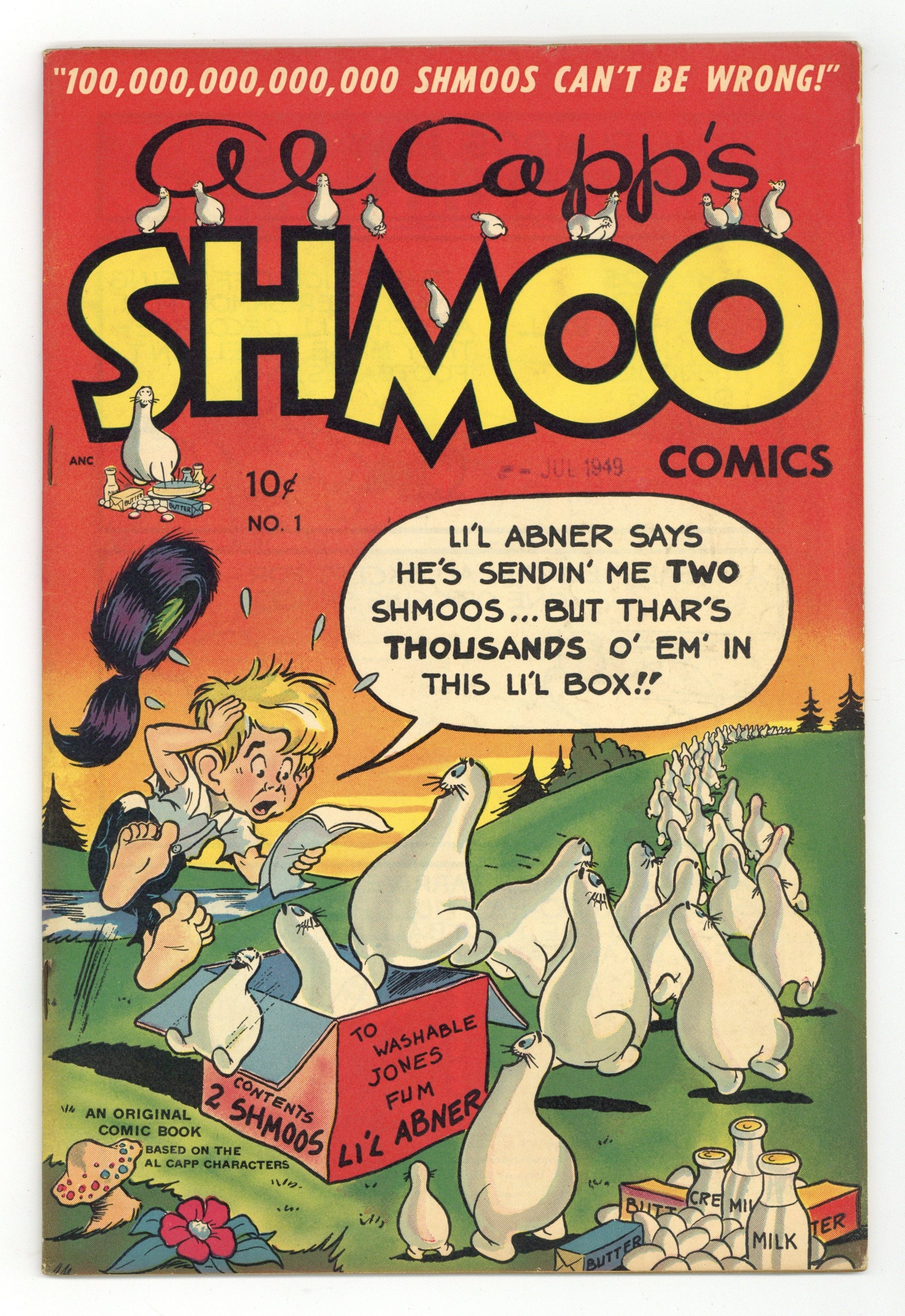 Stories and art by Milt Story and others. The strange little creatures from the classic Li'l Abner comic strip get their own comic book. Washable Jones and his friends the shmoos try to figure out how to extinguish a forest fire on Ol' Timber Top mountain. Washable dares to take on a giant who is trampling the town. The debut of Super Shmoo (with appearances by Sweet Shmoo, Fu Manshmoo and Frankenshmoo's Monster. Plus a vintage ad for US savings bonds featuring the Shmoos and signed by Al Capp. How Shmoos Play Football...; Shmooldering Embers; The Family Life of the Shmoo...; Washable Jones, the Shmoos and the Mysterious Shadow!!; The Wonderful Attic; Super Shmoo. 32 pages, Full Color. Cover price $0.10.