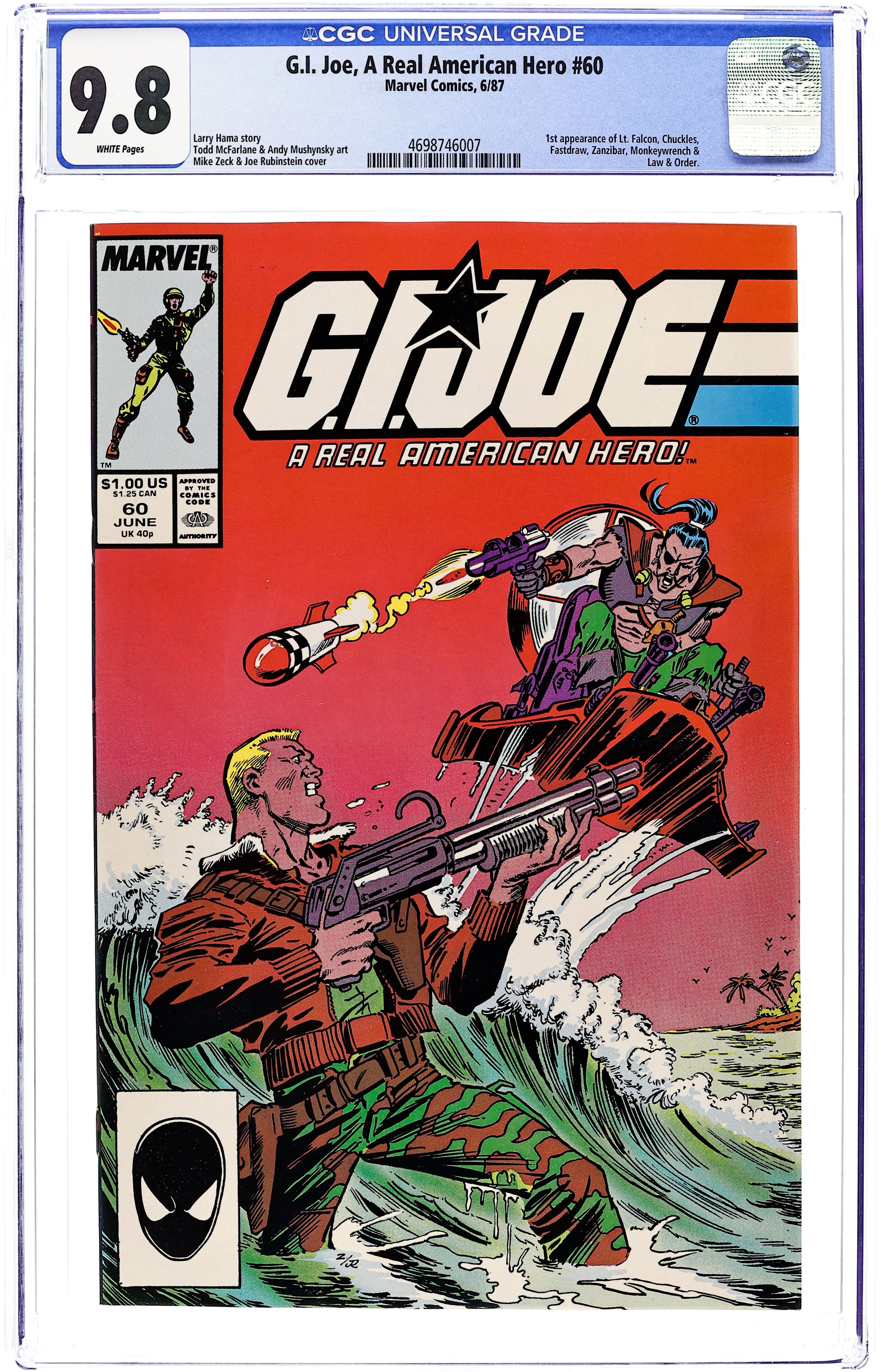Newsstand Edition. Hard to find last issue of this series. Story by Larry Hama. Art by Phil Gosier and Scott Koblish. Ever wondered how the entire G.I. Joe saga ended? G.I. Joe fans LOVE this cover featuring all our favorite Joes folding up the American flag one last time at the PIT Headquarters. The story features a letter from Snake Eyes, (the first time we ever get to hear the silent soldier's thoughts!), detailing his surprising feelings on war and the military. Not only is this a highly collectible final issue, its' a great read too. Cover price $1.50.