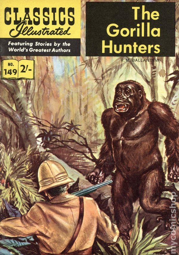 The Gorilla Hunters by R.M. Ballantyne. Two shillings cover price. This title was only printed in Britain, it never appeared in the US. Printed in Sweden. HRN141. Painted cover. 7-in. x 10 1/4-in. Full color.