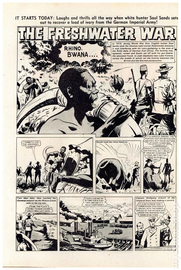 October 30,1976. Published by D.C. Thompson and Co. Ltd. in Great Britain. Action/adventure stories feature the Quest of the Last Six Hundred, Johnny Gurkha, the Punch Pirate, Morgyn the Mighty, Legion of the Lost, Duke Farlow, Taneebo the Thunderbolt, and more. 8.5 x 11.75; black and white; 32 pages; 5p cover price.