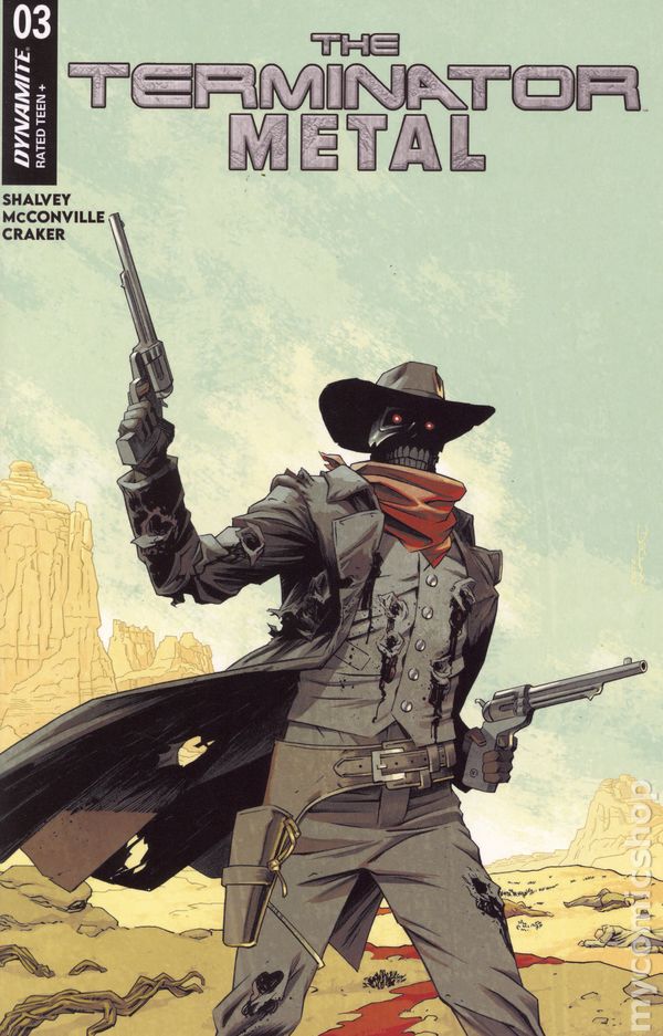 Limited 1 for 25 Retailer Incentive Variant Cover.(W) Declan Shalvey, Rory McConville (A) Colin Craker (CA) Declan Shalvey THE GOOD, THE BAD, AND THE UNSTOPPABLE! Skynet may be an all-powerful AI with nigh-unlimited computing power, but time travel is still an inexact science. And with so many mechanical assassins sent into the past, some are bound to miss their mark by a few days… or months… or decades. When that happens, there are contingency protocols that kick in. Units switch to secondary targets, or find a place of concealment, power down, and wait —for as long as their programming deems necessary. The group of prospectors who uncover one such dormant Terminator on the side of an Oregon mountain in 1889 are, of course, blissfully unaware of this chain of events. But unfortunately for them, the first electric power station in the area has just come online — and they’re now standing between a T-800 and the energy it desperately needs to continue its mission! Local sheriff DECLAN SHALVEY and deputy RORY MCCONVILLE form a creative posse with quick-draw artist COLIN CRAKER for THE TERMINATOR: METAL #3 — featuring a fistful of covers from SHALVEY, BOB LAYTON, SEBASTIAN PIRIZ, and PAOLO ANTIGA! Cover price $4.99.