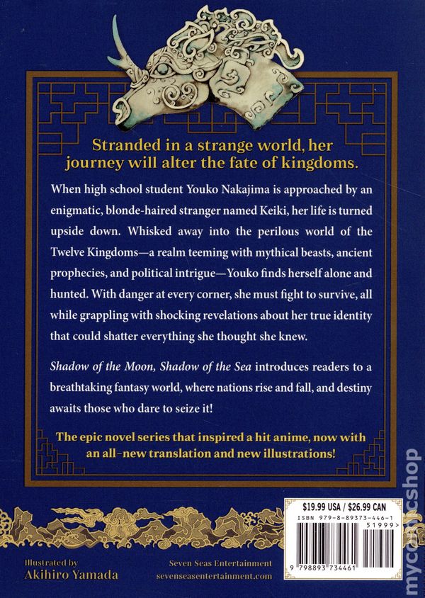 Volume 1 - 1st printing. "Shadow of the Moon, Shadow of the Sea: Part 1 of 2!" Written by Fuyumi Ono. Art and cover by Akihiro Yamada. Translated by Kim Morrisey. Adapted by Monica Sullivan. The epic novel series that inspired a hit anime returns with an all-new translation! Experience a quest for survival and self-discovery as one girl finds herself lost in a strange, unknown world. When high school student Youko Nakajima is approached by an enigmatic, blonde-haired stranger named Keiki, her life is turned upside down. Whisked away into the perilous world of the Twelve Kingdoms—a realm teeming with mythical beasts, ancient prophecies, and political intrigue—Youko finds herself alone and hunted. With danger at every corner, she must fight to survive, all while grappling with shocking revelations about her true identity that could shatter everything she thought she knew. Shadow of the Moon, Shadow of the Sea introduces readers to a breathtaking fantasy world, where nations rise and fall, and destiny awaits those who dare to seize it! Softcover, 5 3/4-in. x 8 1/4-in., 298 pages Text (with B&W Chapter Illustrations). Cover price $19.99.