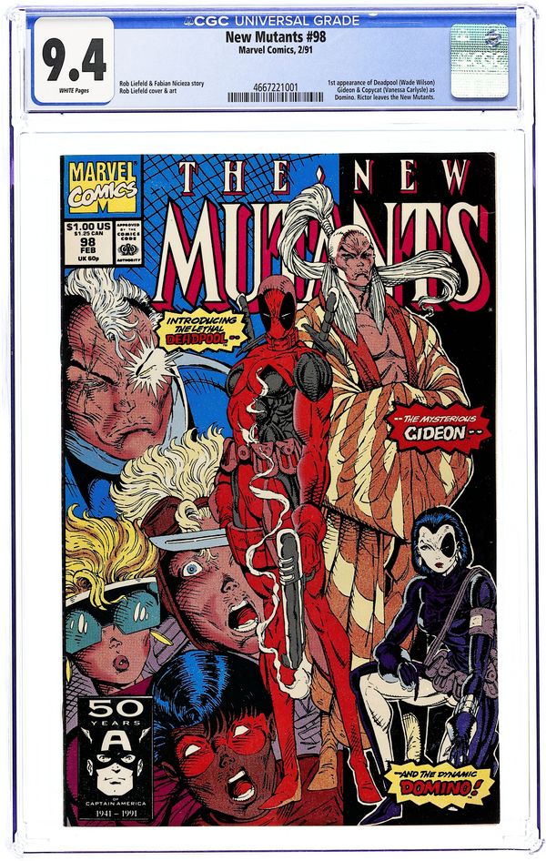 1st appearance of Deadpool, Gideon, and Domino (Impersonated by Copycat). Cover pencils by Rob Liefeld. The Beginning of the End, Part One, script by Rob Liefeld (plot) and Fabian Nicieza (script), art by Rob Liefeld; Gideon arranges for the murder of Sunspot's father; Deadpool, working for Mr. Tolliver, attacks Cable; Domino defeats him; Cable and Domino plot strategy; Rictor decides to go after Wolfsbane, who stayed in Genosha; Gideon tells Sunspot his father is dead. Part 1 of 3. 36 pgs. The Domino that appears in this issue is actually the mutant known as Copycat. The real Domino makes her first real appearance in he pages of X-Force (1991-2002 1st Series) #8 and 11. Cover price $1.00.