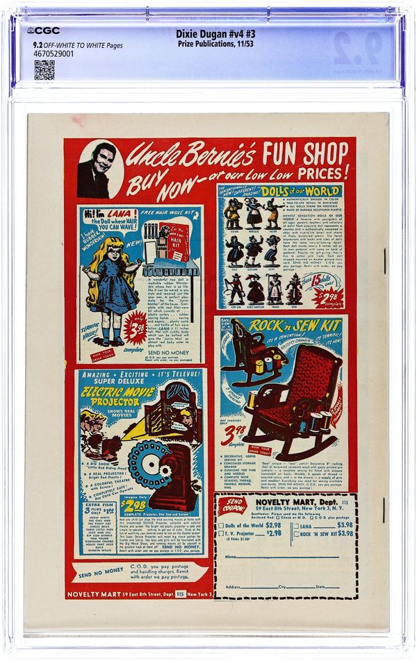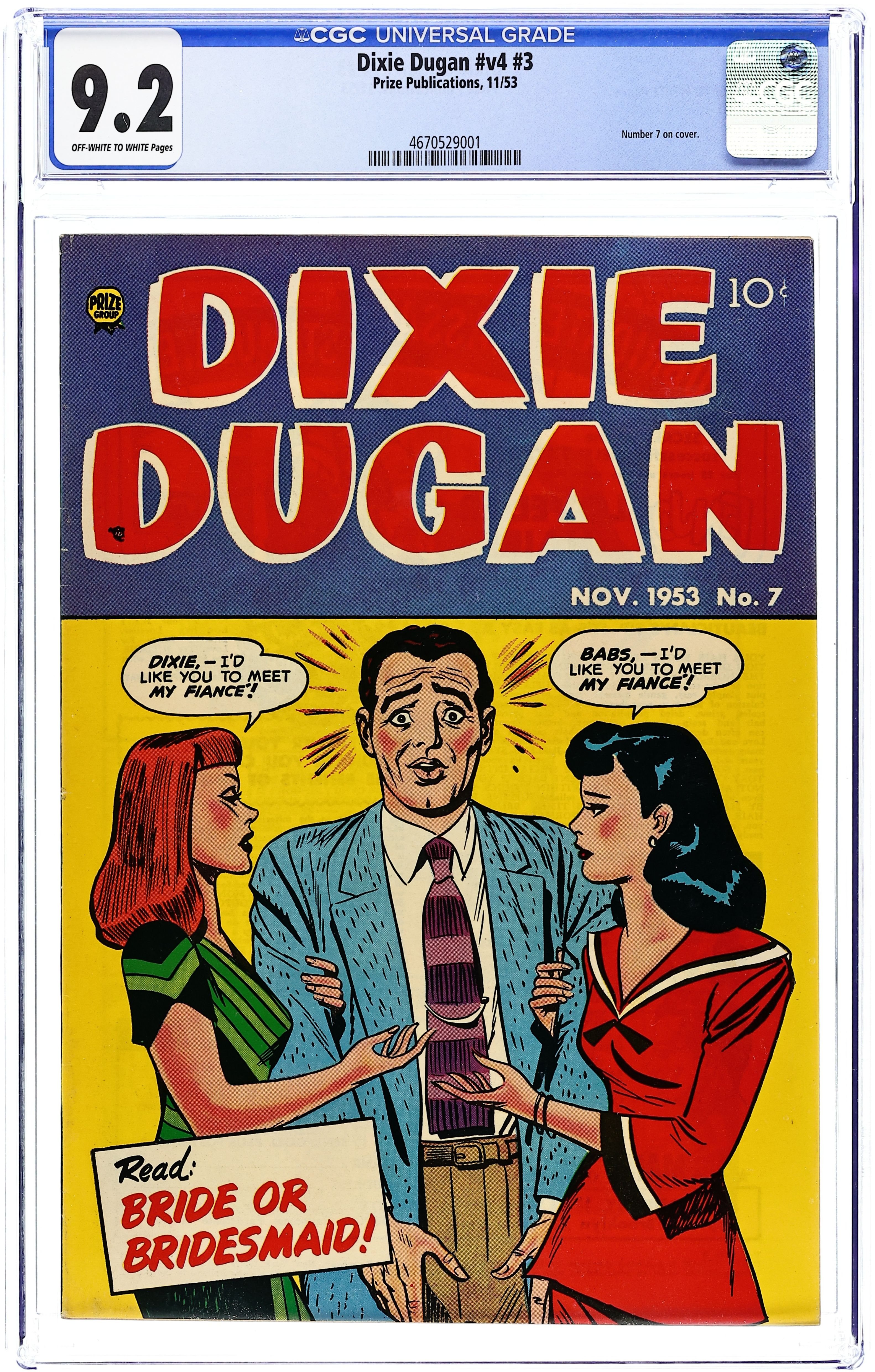 Story by J. P. McEvoy. Art by John Striebel. Reprints of the long-running comic strip, featuring a former showbiz star who encounters adventure and, sometimes, romance. Dixie returns to her job with Ken to find out she's been replaced; worse, she must now share duties with her replacement, standoffish Barbara. Romantic drama between the three of them just complicates things further. But when Dixie's dad almost shoots Ken, things have totally gotten out of hand. 36 pages, Full Color. Cover price $0.10.