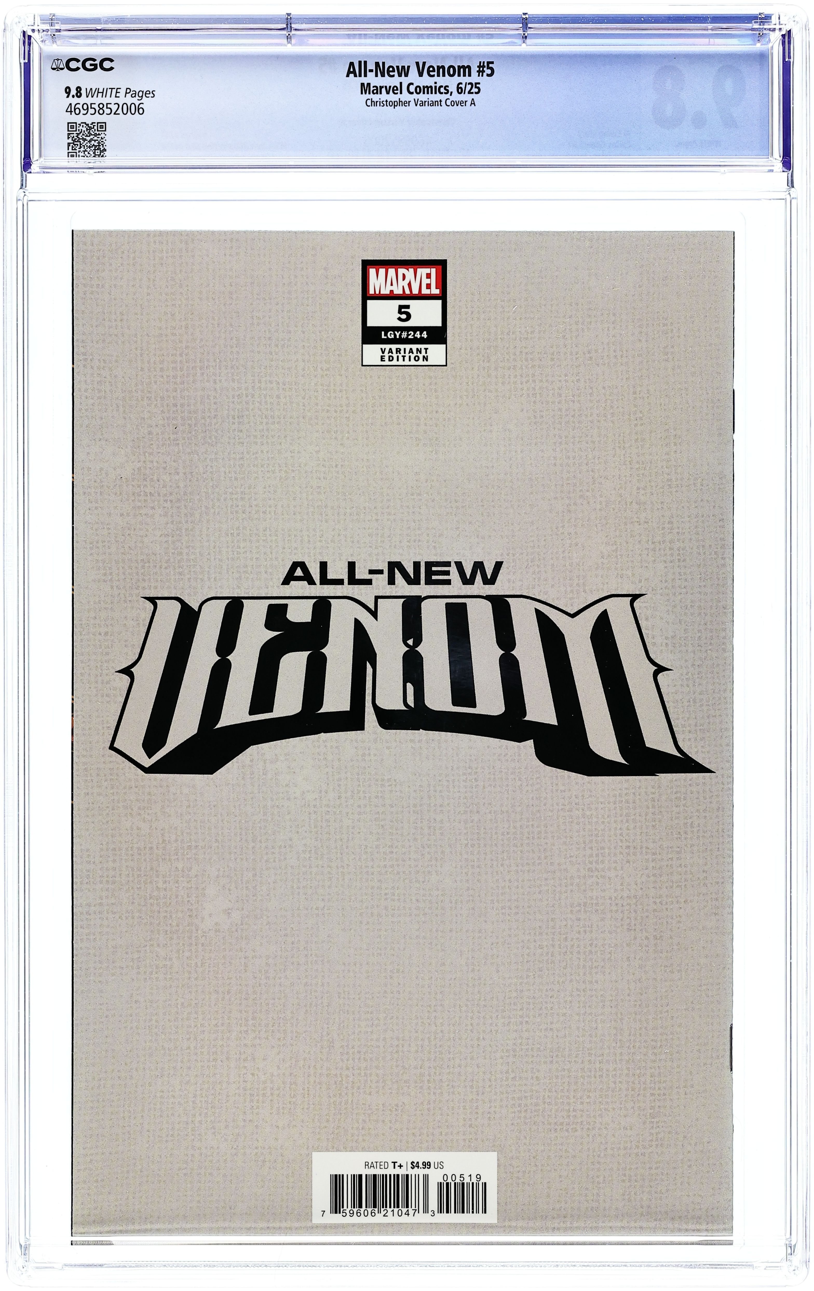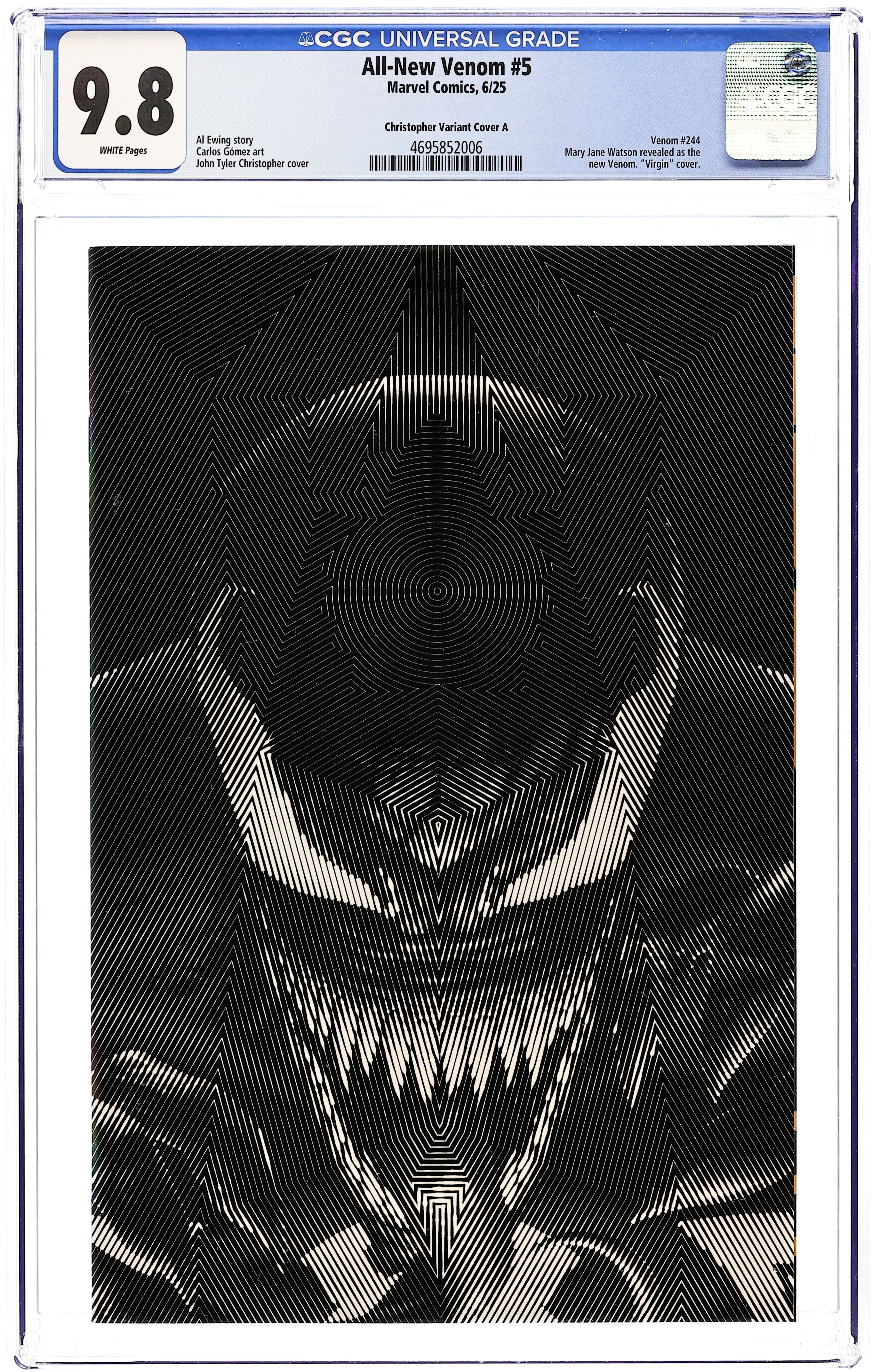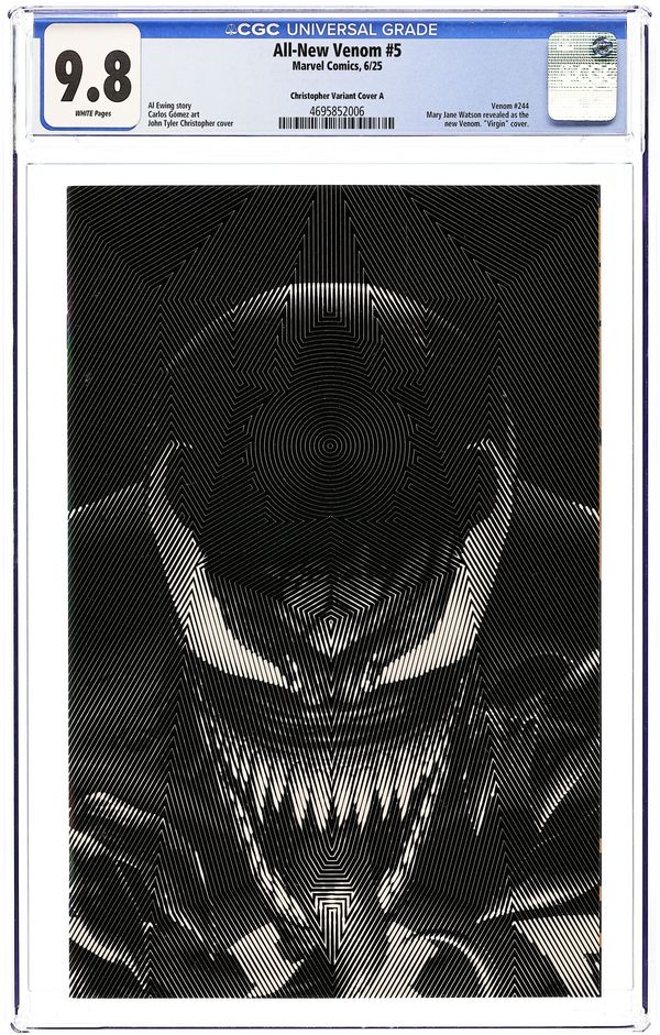 "Venom" Edition Virgin Cover by John Tyler Christopher. Written by Al Ewing. Art by Carlos Gomez. WHO IS THE ALL-NEW VENOM…REVEALED?! When all the red herrings have been weeded out - who's left? The clues have been in front of you the whole time - and by the end of this issue, you WILL know the name of the ALL-NEW VENOM...but with M.O.D.O.K. out for symbiote blood, you might just be identifying the corpse! 32 pages, full color. Rated T+ Cover price $4.99.