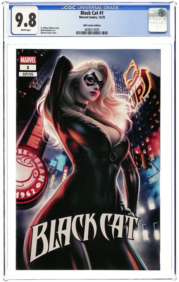 KRS Comics Exclusive Variant Cover by Warren Louw. Written by G. Willow Wilson. Art by Gleb Melnikov. SUPER-THIEF, SUPER…HERO?! FELICIA HARDY is the BLACK CAT, the world's slyest and most skilled super-thief! She loves a good score. The longer the odds - the better! But her entire world turned upside down after THE AMAZING SPIDER-MAN's battle with HELLGATE, so Felicia is turning over a new leaf as New York City's newest…super hero?! The first super villain on her list - THE LIZARD! But will the Black Cat risk it all after her do-gooding moral high ground attracts dangerous attention from the lowest of the city's underworld? Easy, KINGPIN OF CRIME, she's still skimming off the top - honest! Superstar G. WILLOW WILSON joins rising star GLEB MELNIKOV to chart the winding road of twists and turns, laughs and mind-bending action of BLACK CAT's next exciting chapter! 32 pages, full color. Rated T Cover price $4.99.