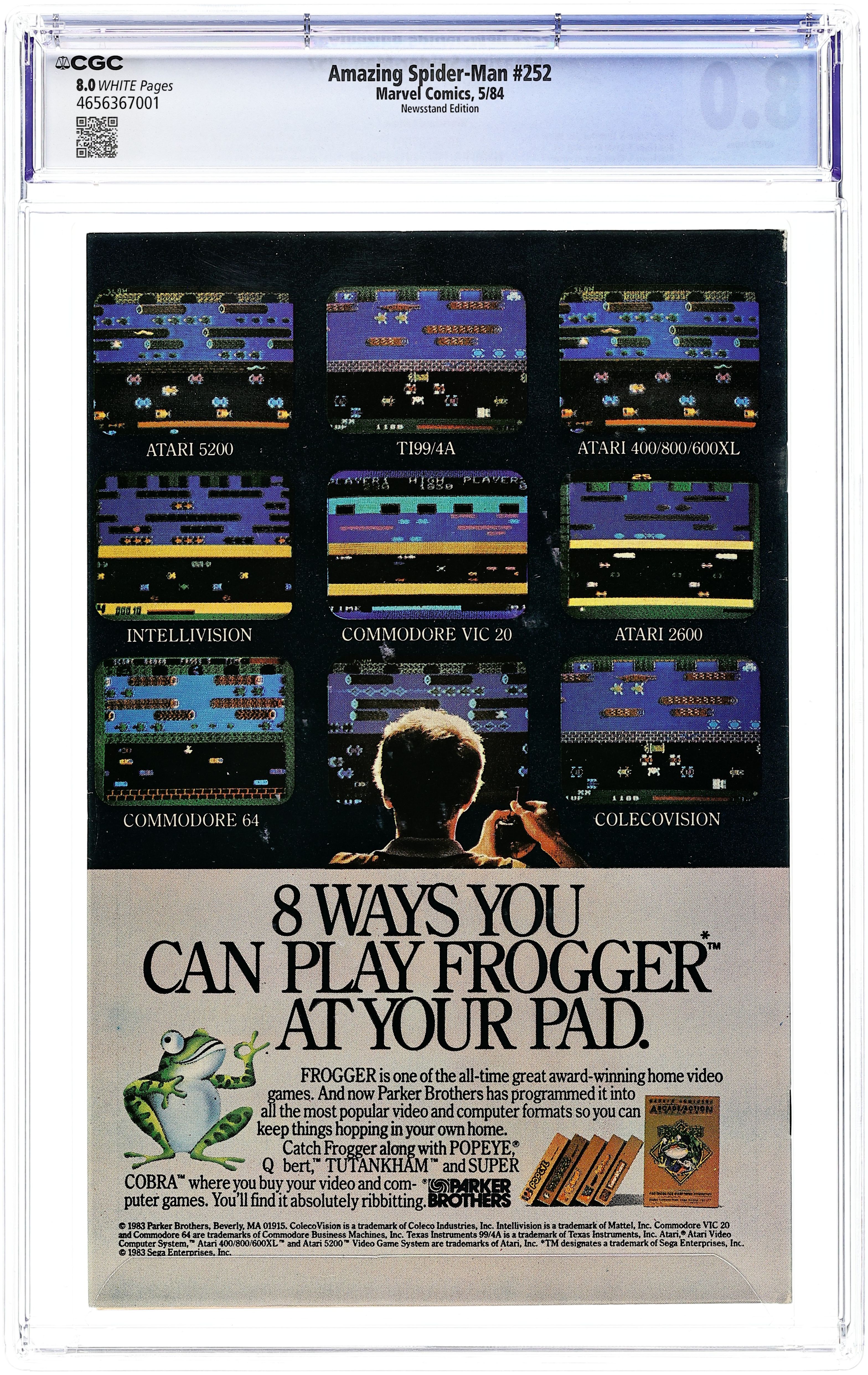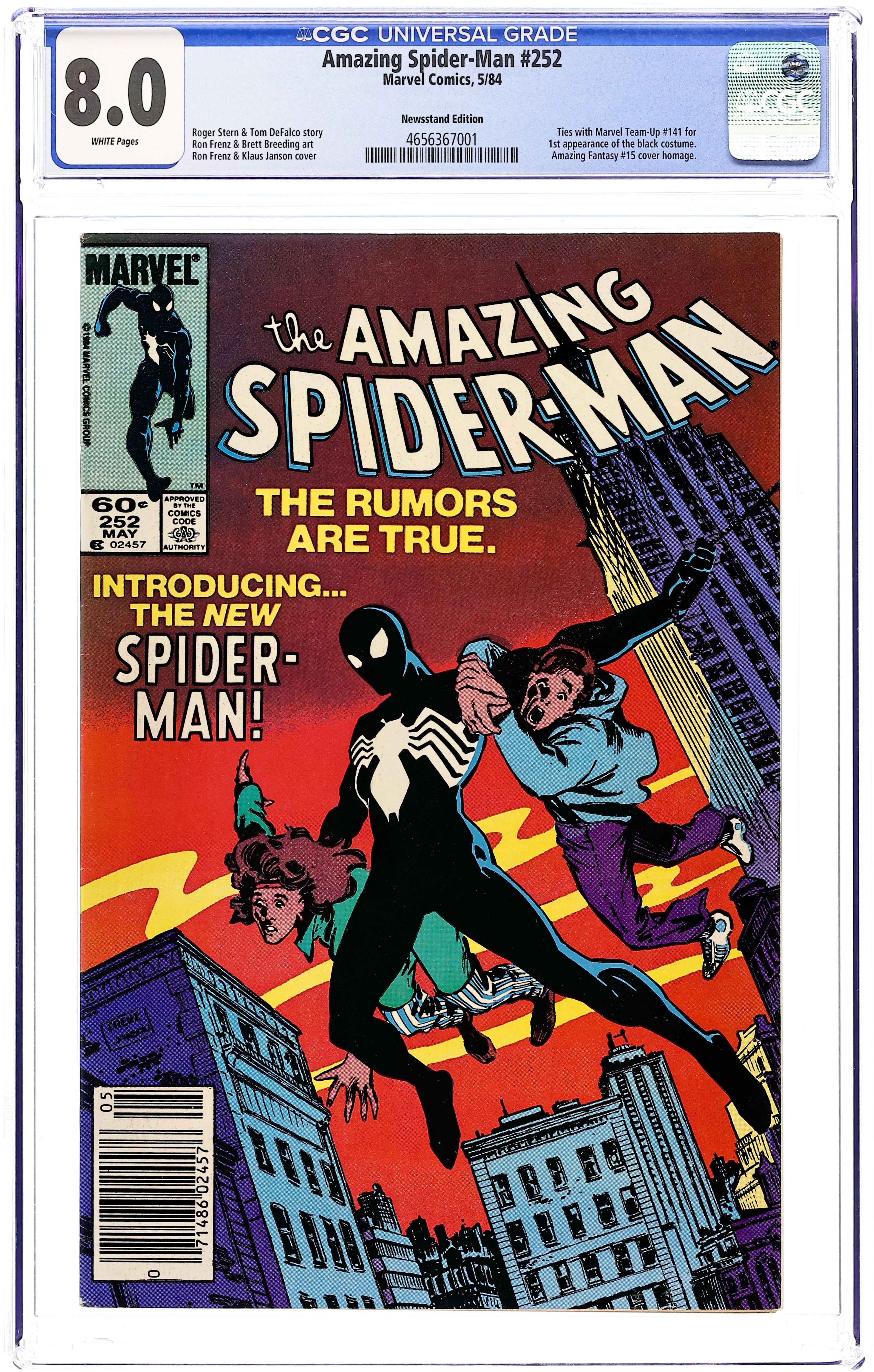 Newsstand Edition. First appearance of Spider-Man's new black (alien symbiote) costume in "Homecoming!" Plot by Roger Stern. Script by Tom DeFalco. Pencils by Ron Frenz (breakdowns) and Brett Breeding (finishes). Cover by Ron Frenz and Klaus Janson. One of the landmark issues of the Amazing Spider-Man! With a brilliant flash of light in Central Park, the wondrous wall-crawler is back! And he looks a whole lot different! Wow, a new costume! What happened during the Secret Wars on the Beyonder's world? The ominous truth will be revealed to both the readers and the web-slinger in the days and weeks ahead! Cameo appearances by the Black Cat, Dr. Curt Connors, J. Jonah Jameson, Joe Robertson , Aunt May, Captain America, Captain Marvel, Hawkeye, Iron Man, Thor, and the Wasp. (Notes: Marvel Age 12 contained sketches of the new costume two months prior to the publication of this issue. Spidey's new costume was also unveiled in Marvel Team-Up 141 and Spectacular Spider-Man 90. The first issue of the (1984) Marvel Super Heroes Secret Wars Limited Series was published the same month as Amazing Spider-Man 252. The web-slinger discovers his new costume in issue 8 of the limited series. The Frenz-Janson cover is a tribute to the iconic cover of Amazing Fantasy 15. This story was reprinted in Marvel Tales 266. The letters page contains a statement of ownership: average print run 470,527; average paid circulation: 241,762. 36 pgs. Cover price $0.60.