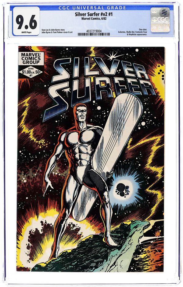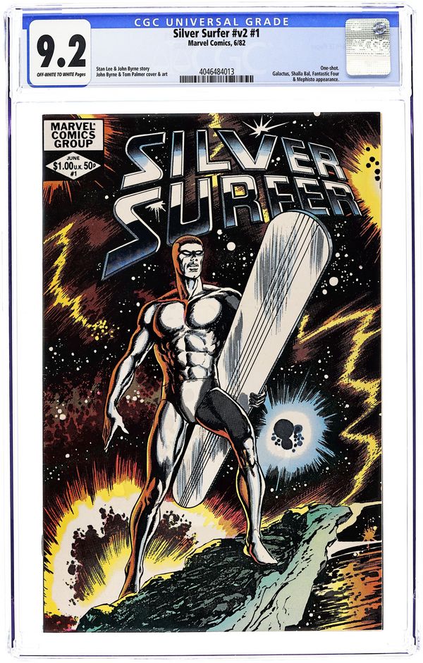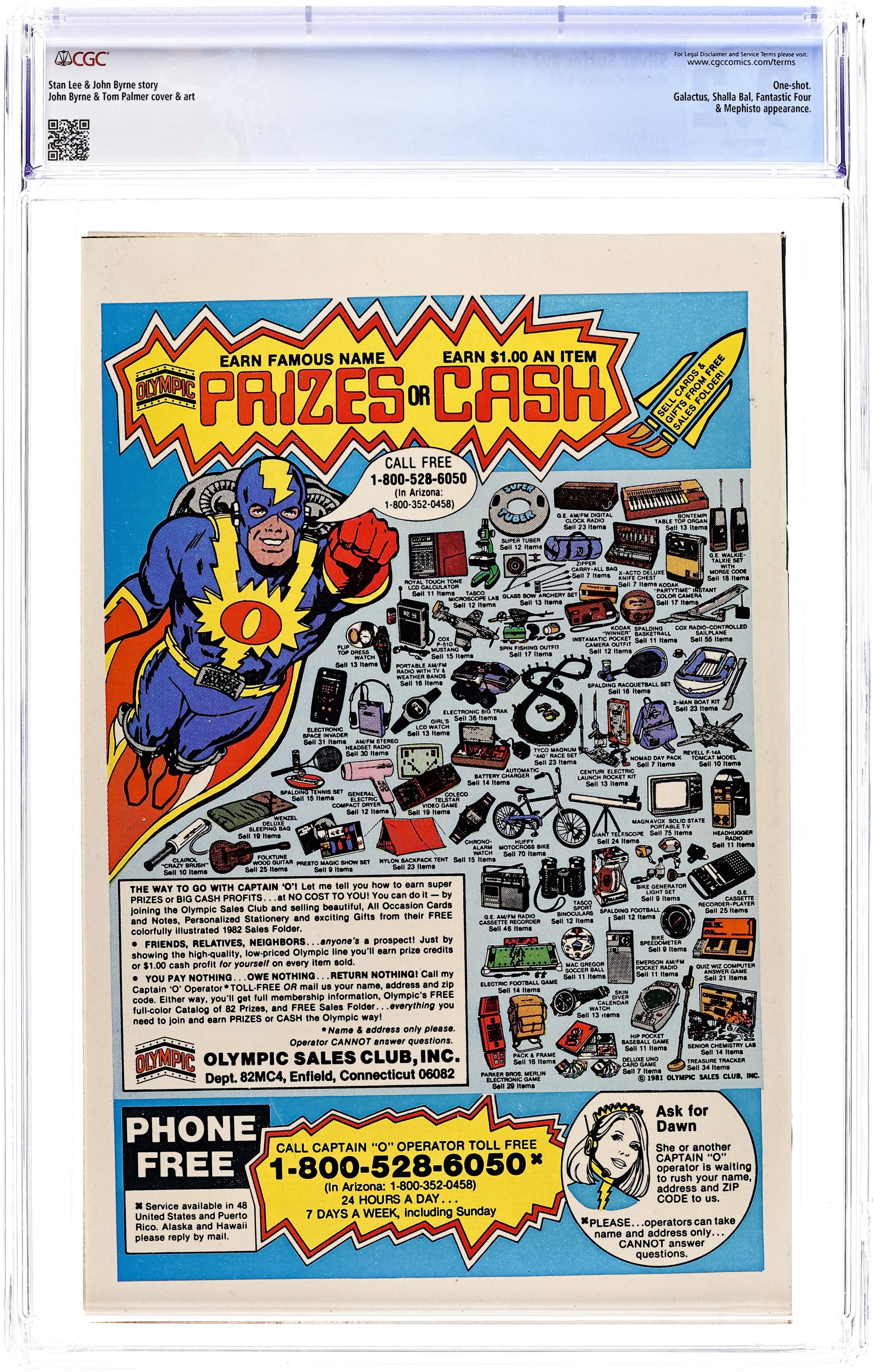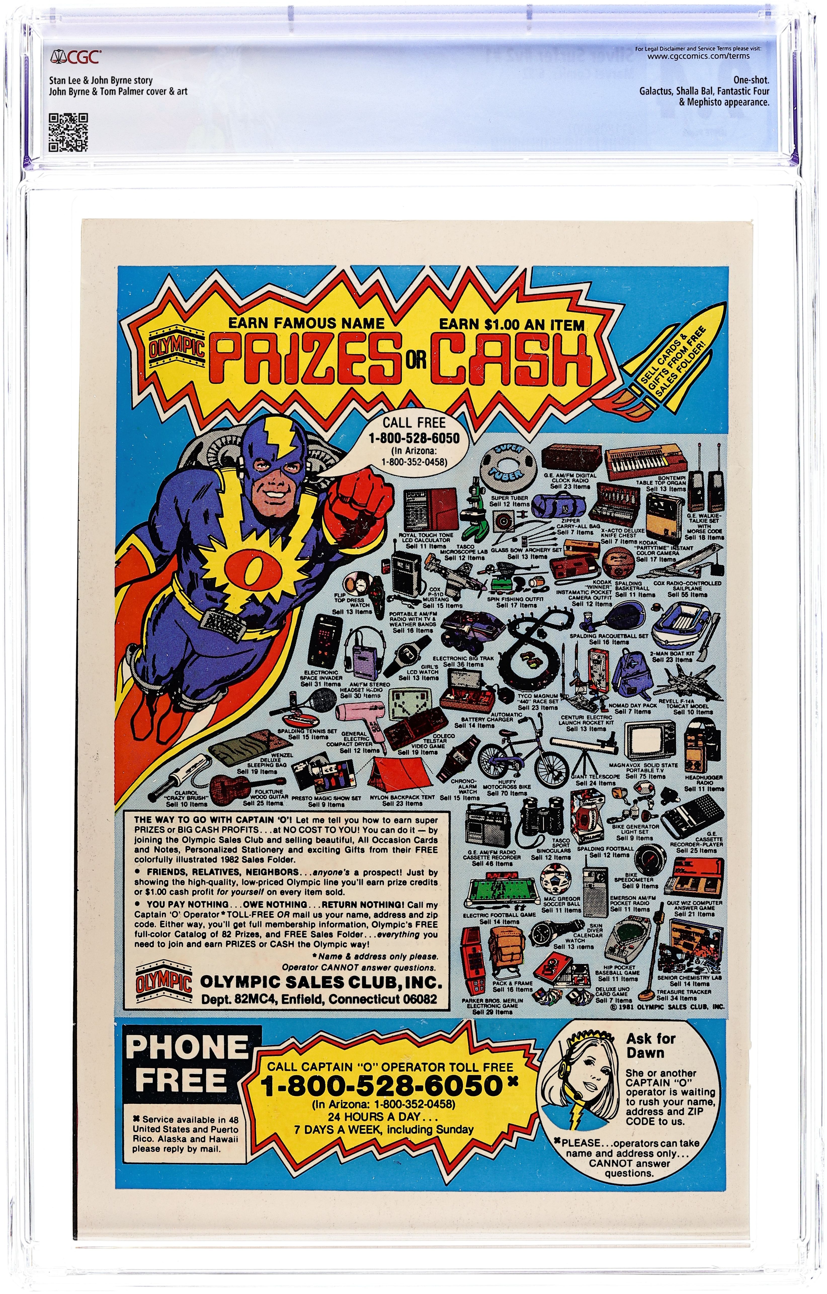 Cover by John Byrne and Tom Palmer. Escape--To Terror!, script by John Byrne and Stan Lee, art by John Byrne and Tom Palmer; The FF help Surfer break the barrier of Galactus, ending his exile on earth & granting him the freedom to roam the spaceways once again; The Surfer returns to Zenn-La to reunite with his love Shalla-Bal but finds that after he betrayed Galactus on earth, the world eater devastated his home world in retaliation; Informed by the survivors that Shalla-Bal was captured by the demon Mephisto, the Surfer flies back to earth & battles the monster in his own realm for her freedom; Beaten but still victorious, Mephisto returns Shalla-Bal to her home world while the Surfer is again trapped on earth. 52 pgs., full color. $1.00. Cover price $1.00.