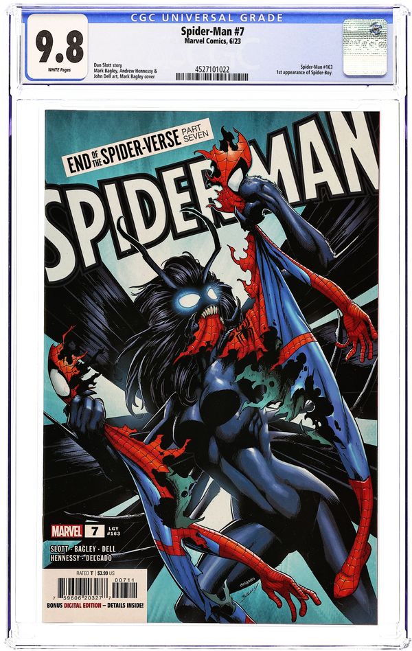 Written by Dan Slott. Art and Cover by Mark Bagley. THE END OF THE SPIDER-VERSE IS HERE! Friends became enemies, enemies became friends and now all of the Spider-Verse ENDS! Jessica Drew? Gone. Peter Parker? Gone. And they aren?t the only ones erased by the sacred Sting-Knife. How can Silk and the rest of the Spiders win this Spider-War?! 28 pages, full color. Rated T Cover price $3.99.