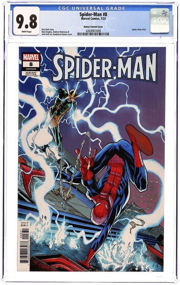 Written by Dan Slott. Art by Mark Bagley. Cover by Humberto Ramos. "The End of the Spider-Verse" continues! Spider-Man has changed. His powers are super-charged, enabling him to be the best Spider-Man he can be… •…but can his all-too-human body take it? A classic Spider-Villain is back and doesn't care if Spidey has his hands full. 28 pages, full color. Rated T Cover price $3.99.