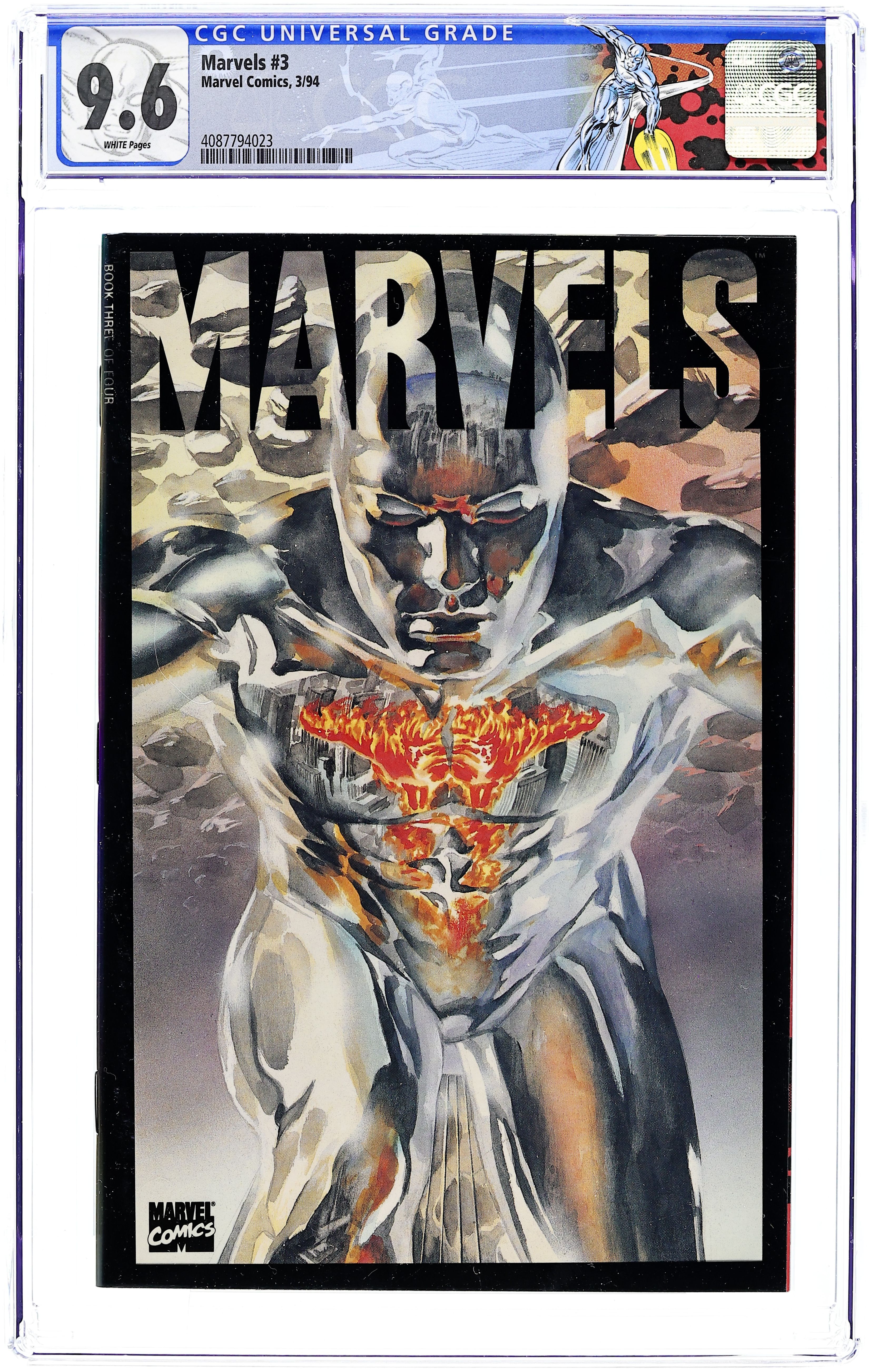 Steeped in unprecedented realism, this groundbreaking series tells the tale of the classic Marvel Universe as seen through the eyes of photojournalist Phil Sheldon. Book three chronicles the coming of Galactus and the Silver Surfer. Written by Kurt Busiek, with painted art by Alex Ross. This is the 1st printing and has an acetate (plastic) outer cover. The 2nd printing does not have an acetate cover. Cover price $5.95.