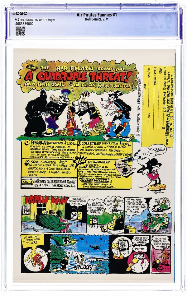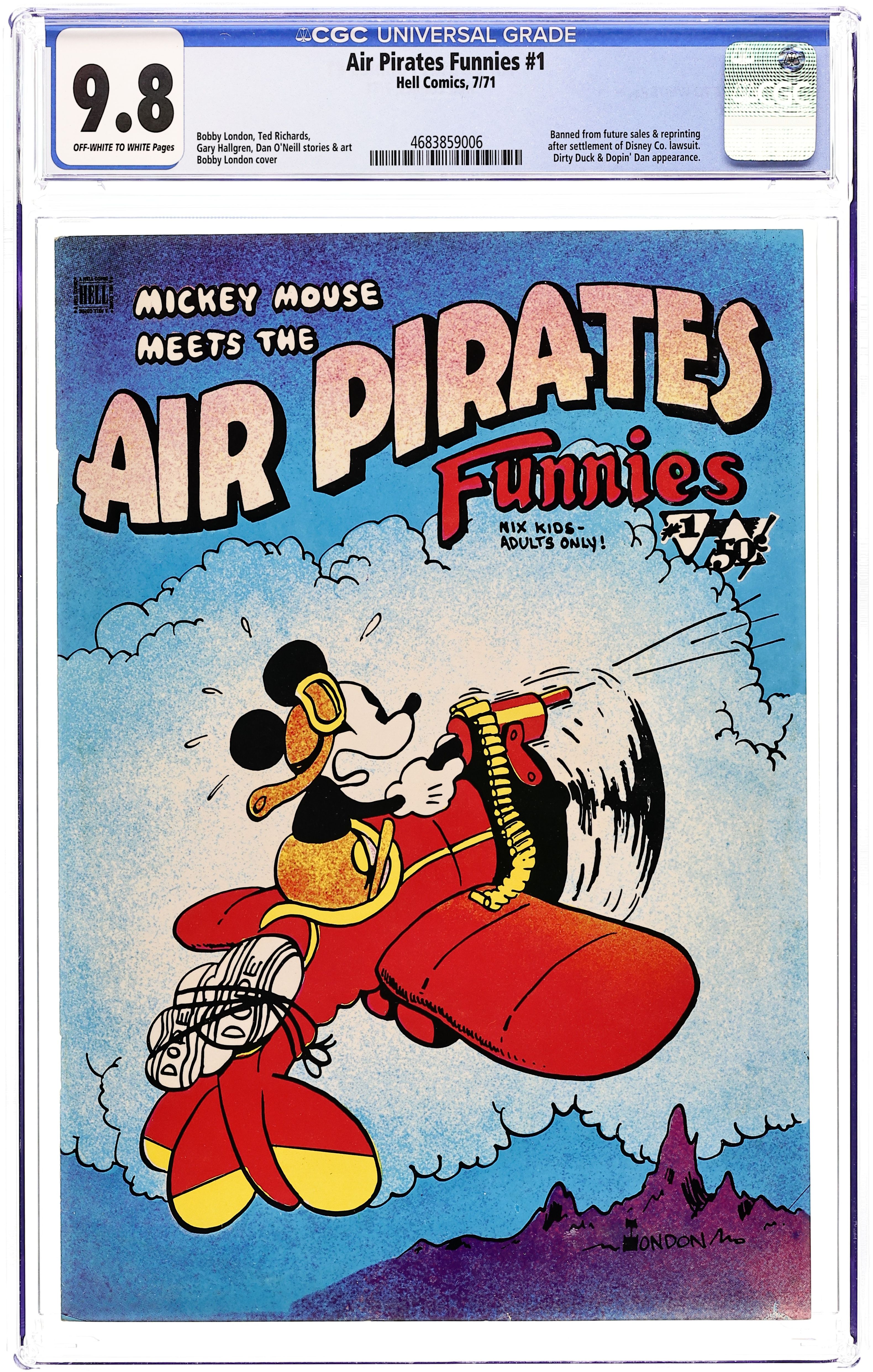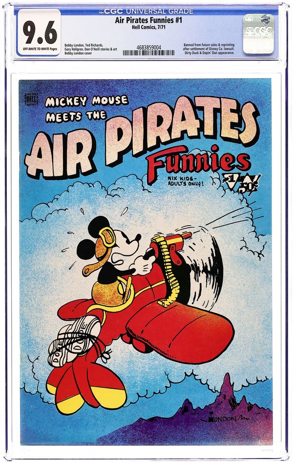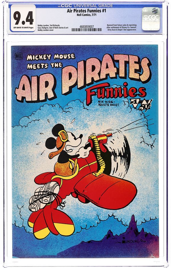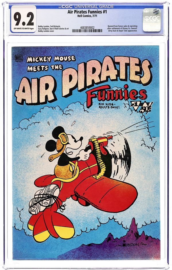 Controversial parody discontinued due to Disney lawsuit. The Air Pirates were a group of cartoonists who created two issues of an underground comic called Air Pirates Funnies in 1971, leading to a famous lawsuit by The Walt Disney Company. Founded by Dan O'Neill, the group also included Shary Flenniken, Bobby London, Gary Hallgren, and Ted Richards. The collective shared a common interest in the styles of past masters of the comic strip: Flenniken emulated George McManus's Bringing Up Father in her Trots and Bonnie comics, London's strip Dirty Duck paid homage to the styles of E.C. Segar's Thimble Theater and George Herriman's Krazy Kat, and Richards' Dopin' Dan was similar to Mort Walker's Beetle Bailey. The original Air Pirates were a gang of Mickey Mouse antagonists of the 1930s; O'Neill regarded Mickey Mouse as a symbol of conformist hypocrisy in American culture, and therefore a ripe target for satire. The first issue of Air Pirates Funnies was dated July 1971, and the second issue dated August. Both were published under the Hell Comics imprint, and were distributed through Ron Turner's Last Gasp publishing company. The lead stories in both issues, created by O'Neill and Hallgren, focused on Walt Disney characters, most notably from Floyd Gottfredson's Mickey Mouse newspaper strip, with the Disney characters engaging in adult behaviors such as sex and drug consumption. O'Neill insisted it would dilute the parody to change the names of the characters, so his adventurous mouse character was called "Mickey" Cover price $0.50.