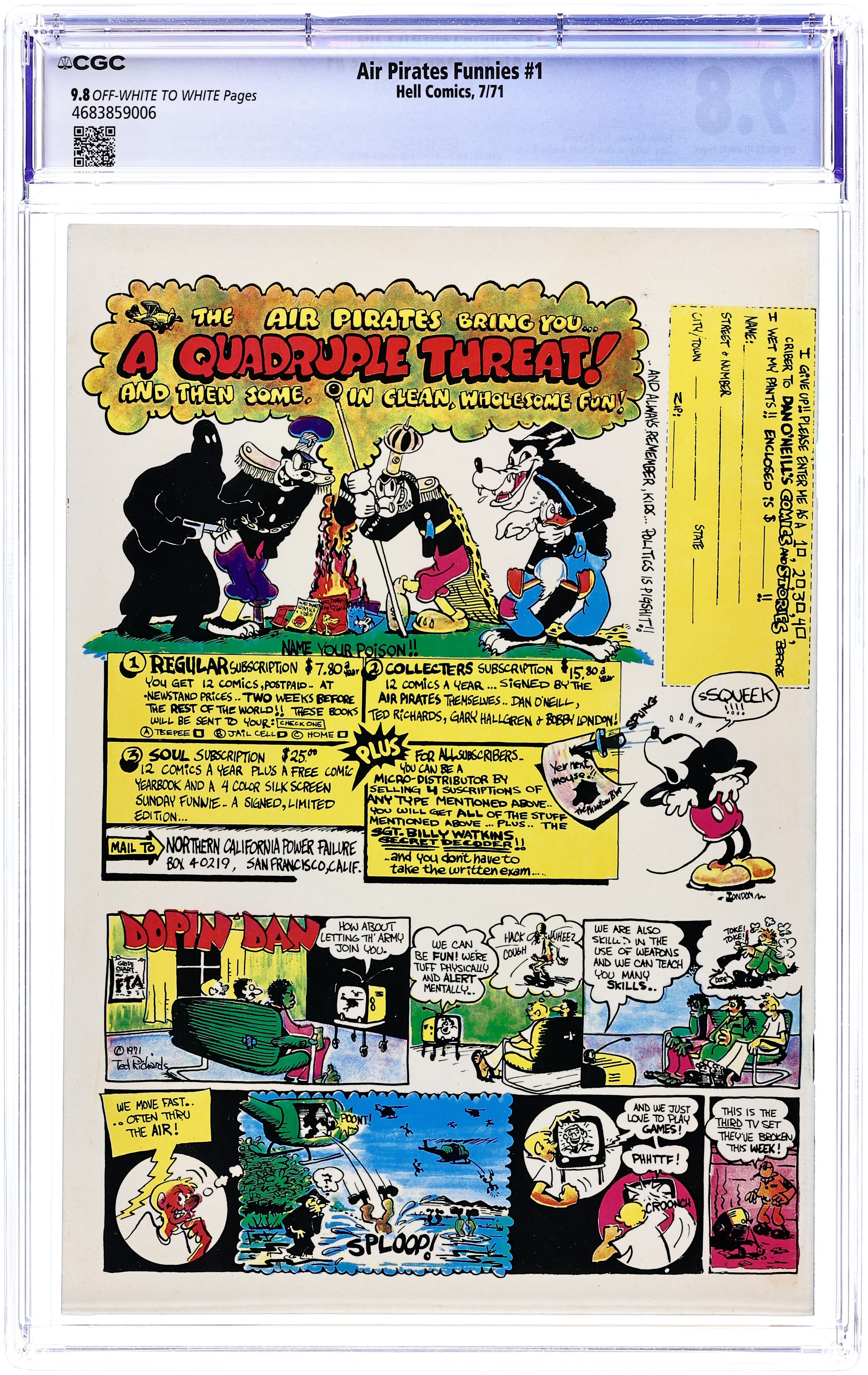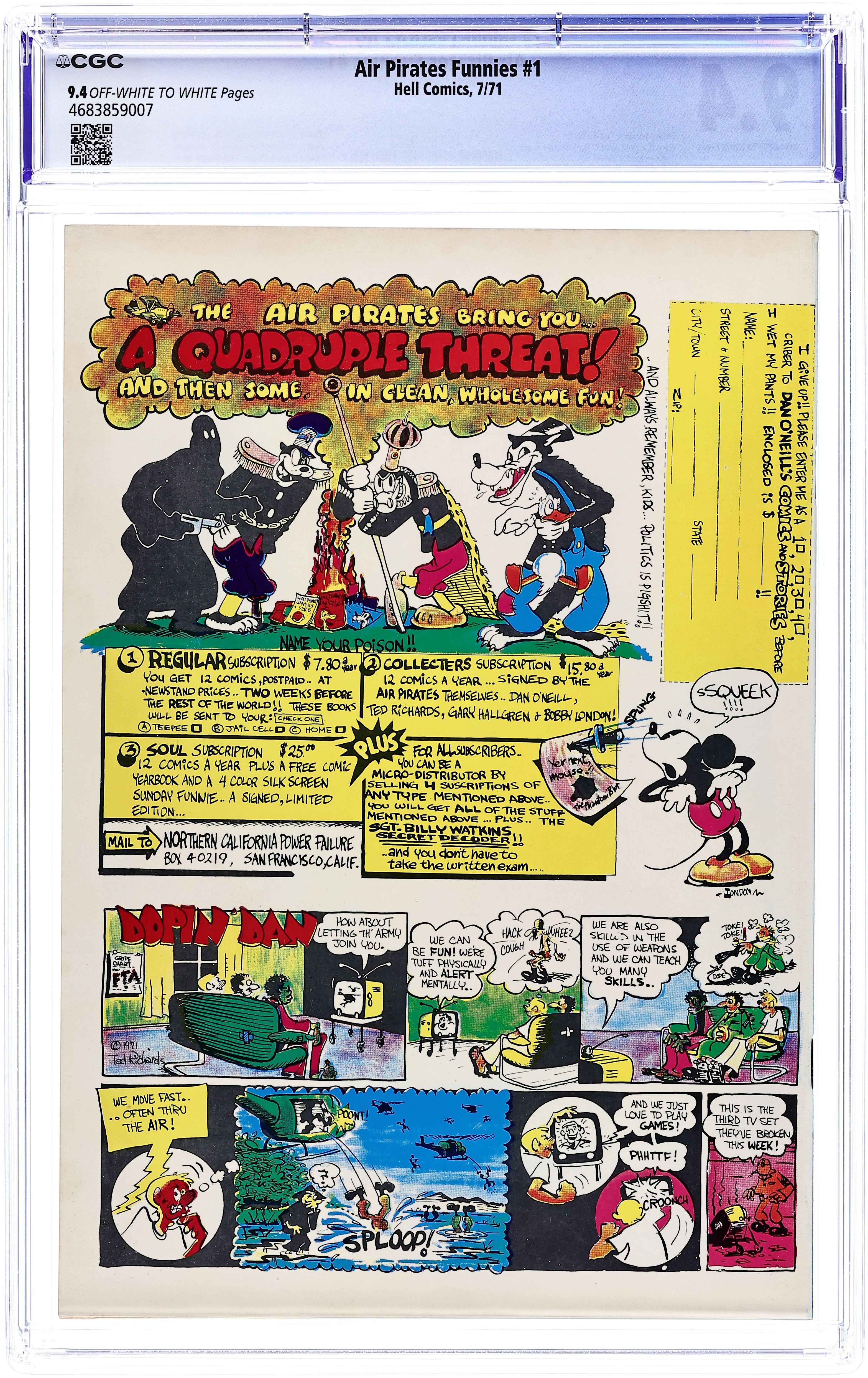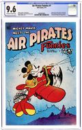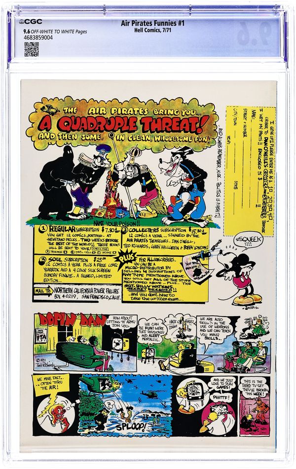 Controversial parody discontinued due to Disney lawsuit. The Air Pirates were a group of cartoonists who created two issues of an underground comic called Air Pirates Funnies in 1971, leading to a famous lawsuit by The Walt Disney Company. Founded by Dan O'Neill, the group also included Shary Flenniken, Bobby London, Gary Hallgren, and Ted Richards. The collective shared a common interest in the styles of past masters of the comic strip: Flenniken emulated George McManus's Bringing Up Father in her Trots and Bonnie comics, London's strip Dirty Duck paid homage to the styles of E.C. Segar's Thimble Theater and George Herriman's Krazy Kat, and Richards' Dopin' Dan was similar to Mort Walker's Beetle Bailey. The original Air Pirates were a gang of Mickey Mouse antagonists of the 1930s; O'Neill regarded Mickey Mouse as a symbol of conformist hypocrisy in American culture, and therefore a ripe target for satire. The first issue of Air Pirates Funnies was dated July 1971, and the second issue dated August. Both were published under the Hell Comics imprint, and were distributed through Ron Turner's Last Gasp publishing company. The lead stories in both issues, created by O'Neill and Hallgren, focused on Walt Disney characters, most notably from Floyd Gottfredson's Mickey Mouse newspaper strip, with the Disney characters engaging in adult behaviors such as sex and drug consumption. O'Neill insisted it would dilute the parody to change the names of the characters, so his adventurous mouse character was called "Mickey" Cover price $0.50.