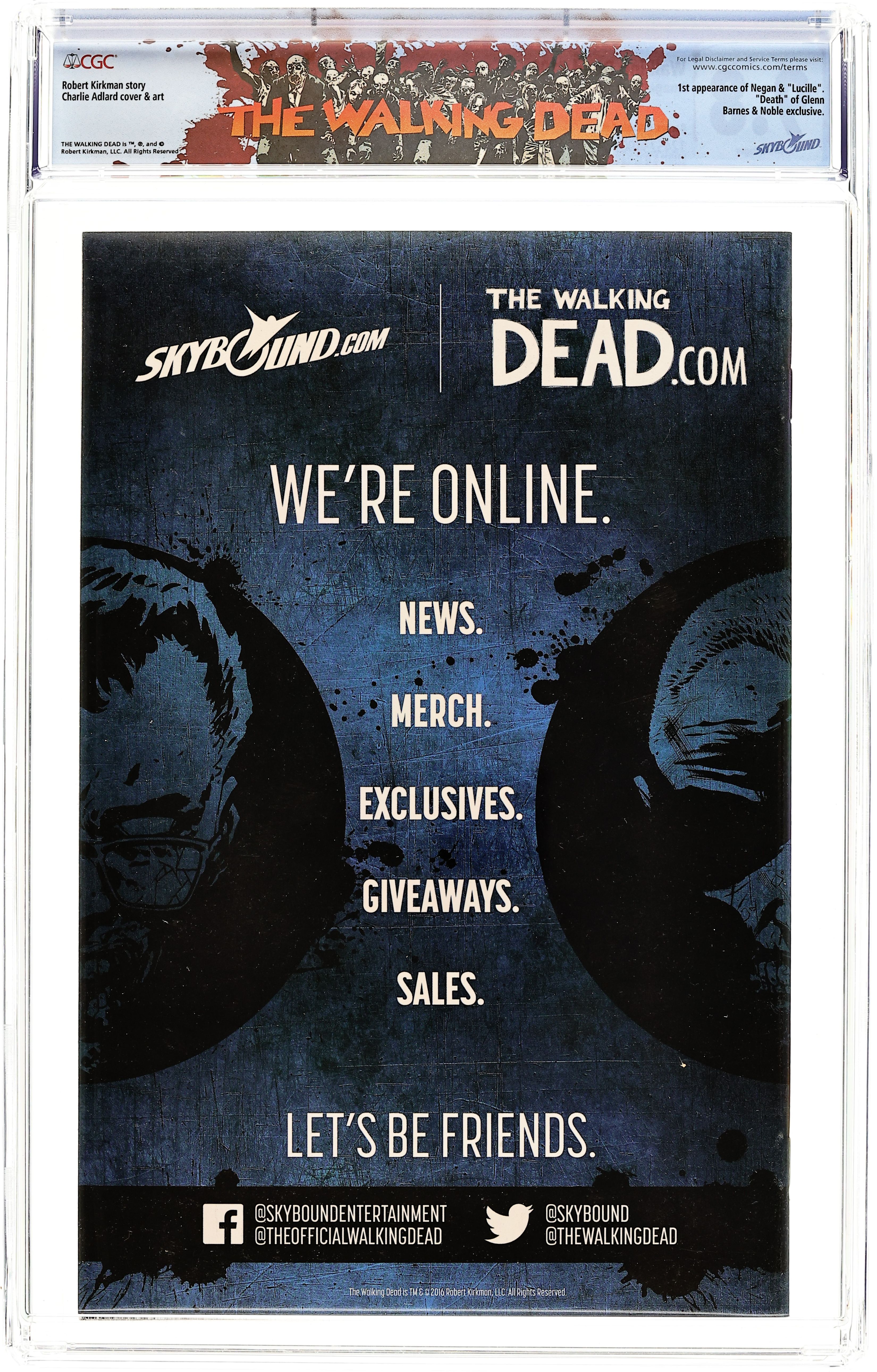 Ends Mar 9 9:58 PM CST Bid History 5 bids Current Bid $29 Your Secret Max Bid If you'd like to bid, please log in or register. Cover by Marc Silvestri. First appearance of Negan & "Lucille", Death of Glenn. Something to Fear: Part 4 of 6 - (W) Robert Kirkman (A) Charlie Adlard, Cliff Rathburn 'SOMETHING TO FEAR' CONTINUES! This extra-sized chapter contains one of the darkest moments in Rick Grimes' life, and one of the most violent and brutal things to happen within the pages of this series. 100 issues later, this series remains just as relentless as the debut issue. Do not miss the monumental 100th issue of THE WALKING DEAD! NOTE: 1st Appearance of of Negan & Lucille. Cover price $3.99.