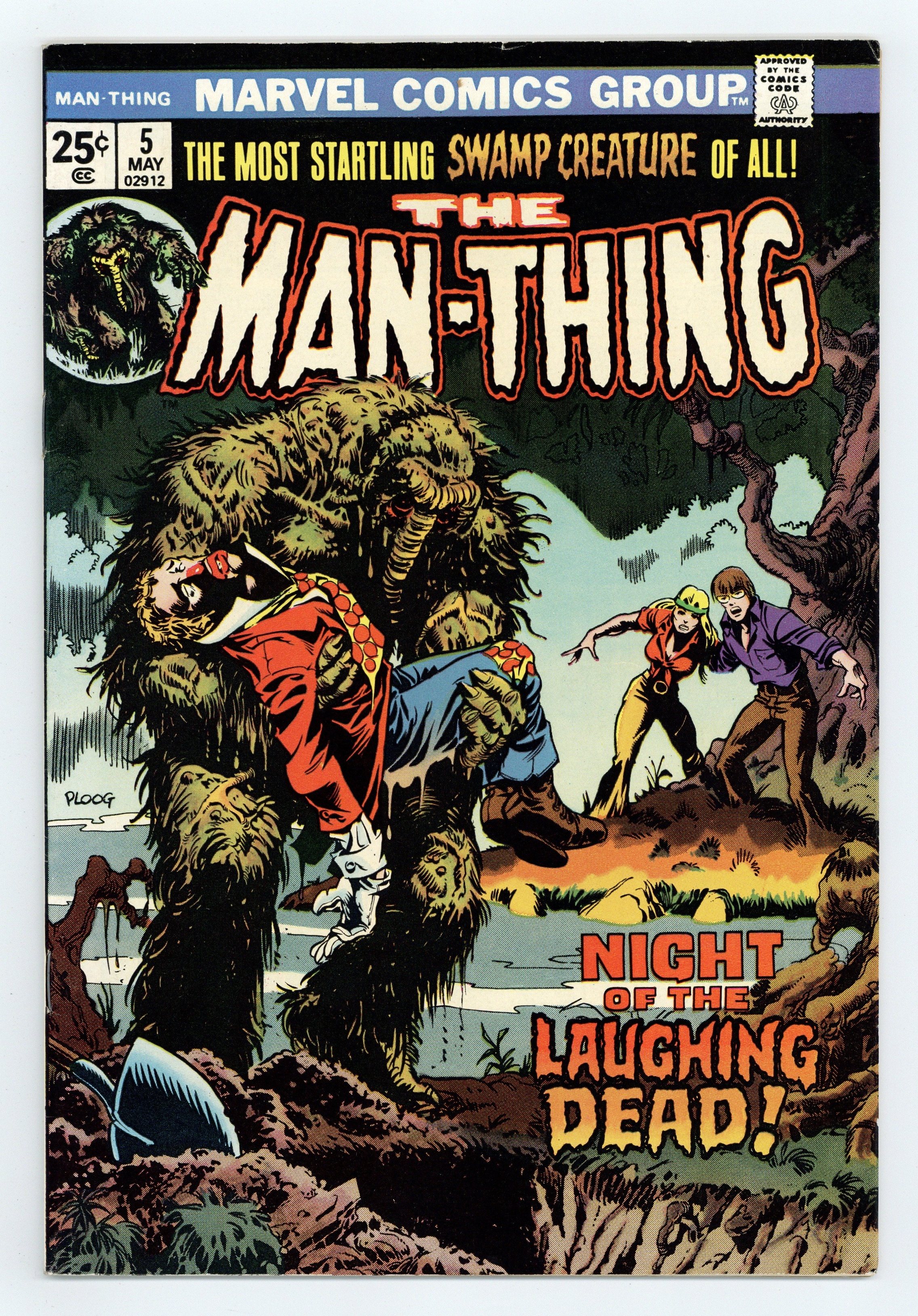 "Night of the Laughing Dead!" Written by Steve Gerber. Art by Mike Ploog and Frank Chiaramonte. The Man-Thing and his companions face the sinister assault of a spectral fiend. Includes Marvel Value Stamp. 32 pages, FC. Cover price $0.25.