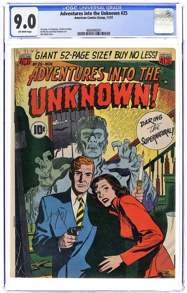 "The Were-Tiger of Assam," "The Zombie's Eyes," "The Spectral Pirate," and "Assault From the Unknown." Edited by Richard E. Hughes. Cover by Ken Bald. Stories by Charles Sultan, Lin Streeter, Al Camy, Ed Moritz, and Paul Gattuso. Spine-chilling tales of suspense, horror, and the supernatural—prepare yourself for Adventures into the Unknown! 52 pages, full color. $0.10. Cover price $0.10.
