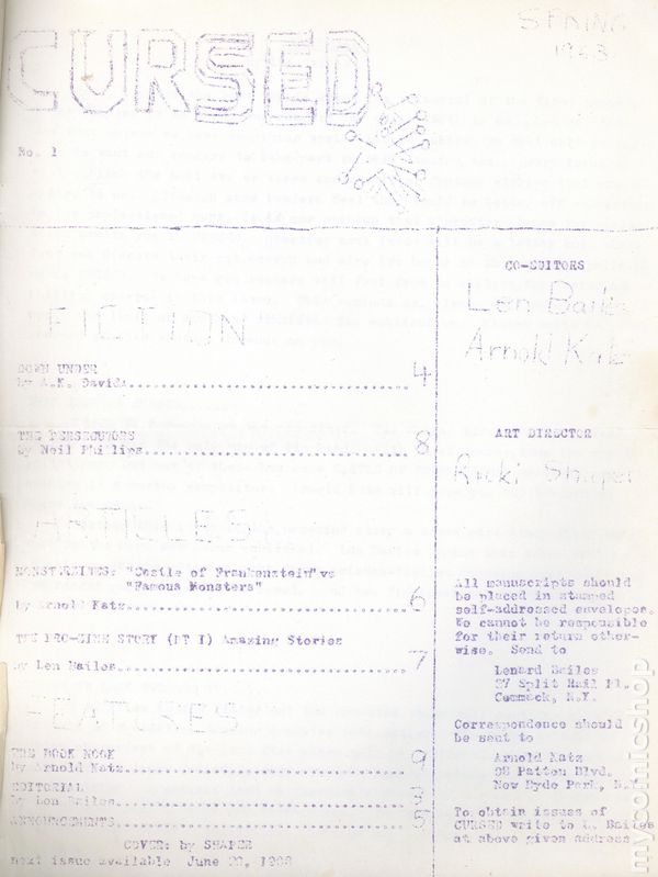 Early Fanzine from Lenny Bailes and Arnie Katz. This production betrays little of the fan-writing and editing skills which these talents would later display, individually and together. 8.5" x 11", 9 single-sided pages, mimeo. Cover price $0.10.