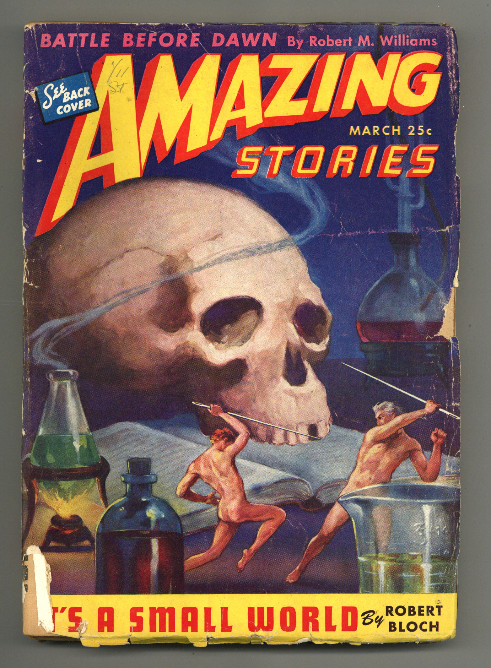 Volume 18, Issue 2 - March, 1944. Science fiction stories by Robert Bloch, Mort Weisinger (of DC Comics fame), Don Wilcox, Leroy Yerxa, Robert Moore Williams, Helmar Lewis, Ed Earl Repp, and Berkeley Livingston. This issue also contains a story, "The Superman," by Meyer Friedenson; it was the winning entry of a contest sponsored by the magazine. (One of the runner-ups was Eando Binder.) Letter-to-editor by 15-year-old Philip K. Dick. Illustrations by J. Allen St. John, Virgil Finlay, Hadden, Malcolm Smith, Magarian, and Robert Fuqua. Cover by St. John. 7-in. x 10-in.; black and white; 214 newsprint pages. Cover price $0.25.