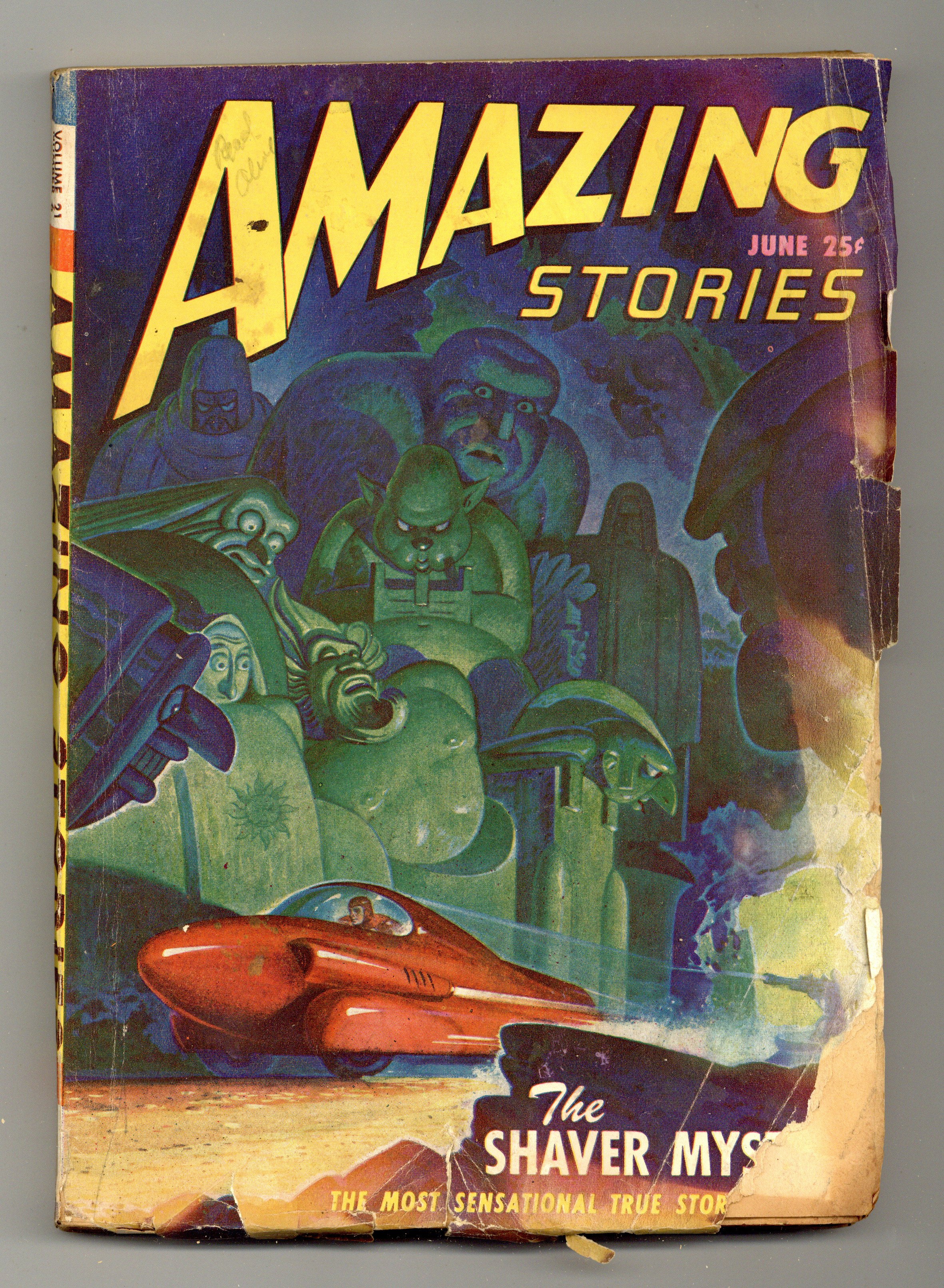 Volume 21, Issue 6 - June, 1947. Cover by Robert Gibson Jones. Special "Shaver Mystery" issue! Dero shenanigans abound in four separate stories by Richard S. Shaver -- no doubt heavily edited and re-written by the Grand Organizer of the "Shaver Mystery," Amazing Stories editor Ray Palmer. Illustrations by Malcolm Smith, Enoch Sharp, Brady, Julian S. Krupa, and Robert Fuqua. 7" x 10"; black and white with color cover; 180 newsprint pages. Cover price $0.25.
