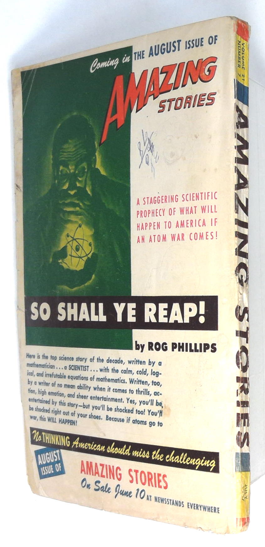 Volume 21, Issue 7 - July, 1947. Cover by Julian Krupa. Stories by Charles S. Geier, Guy Archette, Robert Moore Williams, and Alexander Blade. Illustrations by Malcolm Smith, Enoch Sharp, and Julian S. Krupa. 7" x 10"; black and white with color cover; 180 newsprint pages. Cover price $0.25.