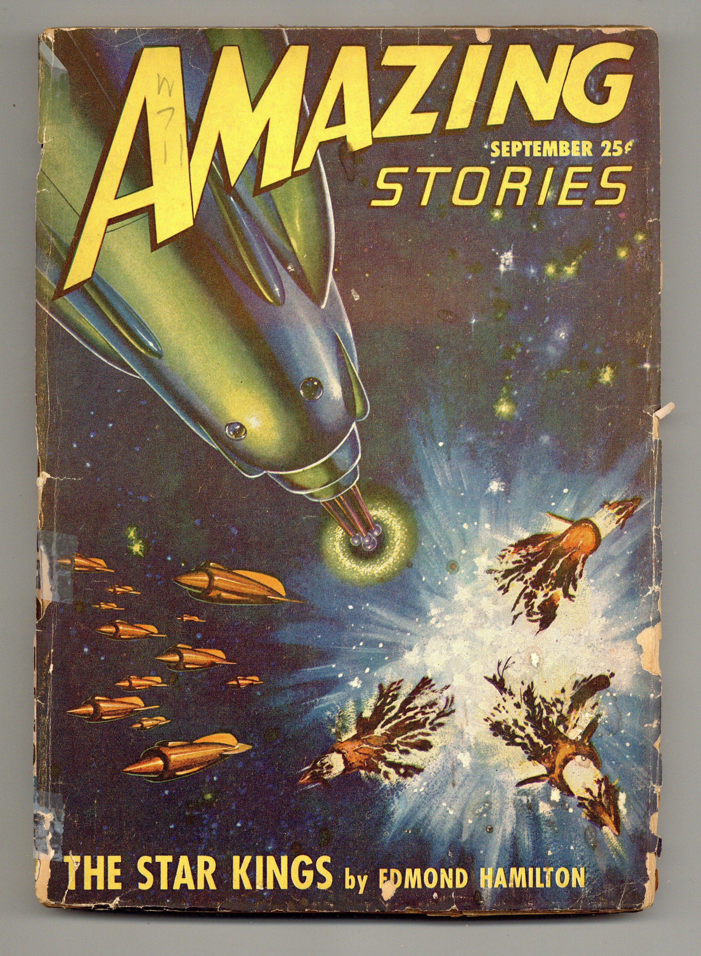 Volume 21, Issue 9 - September, 1947. Cover by Malcolm Smith. Stories by Edmond Hamilton ("The Star Kings"), Rog Phillips, Lee Francis, and Frances Yerxa. Illustrations by Malcolm Smith, Joe Wirt Tillotson, Enoch Sharp, and Rod Ruth. 7" x 10"; black and white with color cover; 180 newsprint pages. Cover price $0.25.