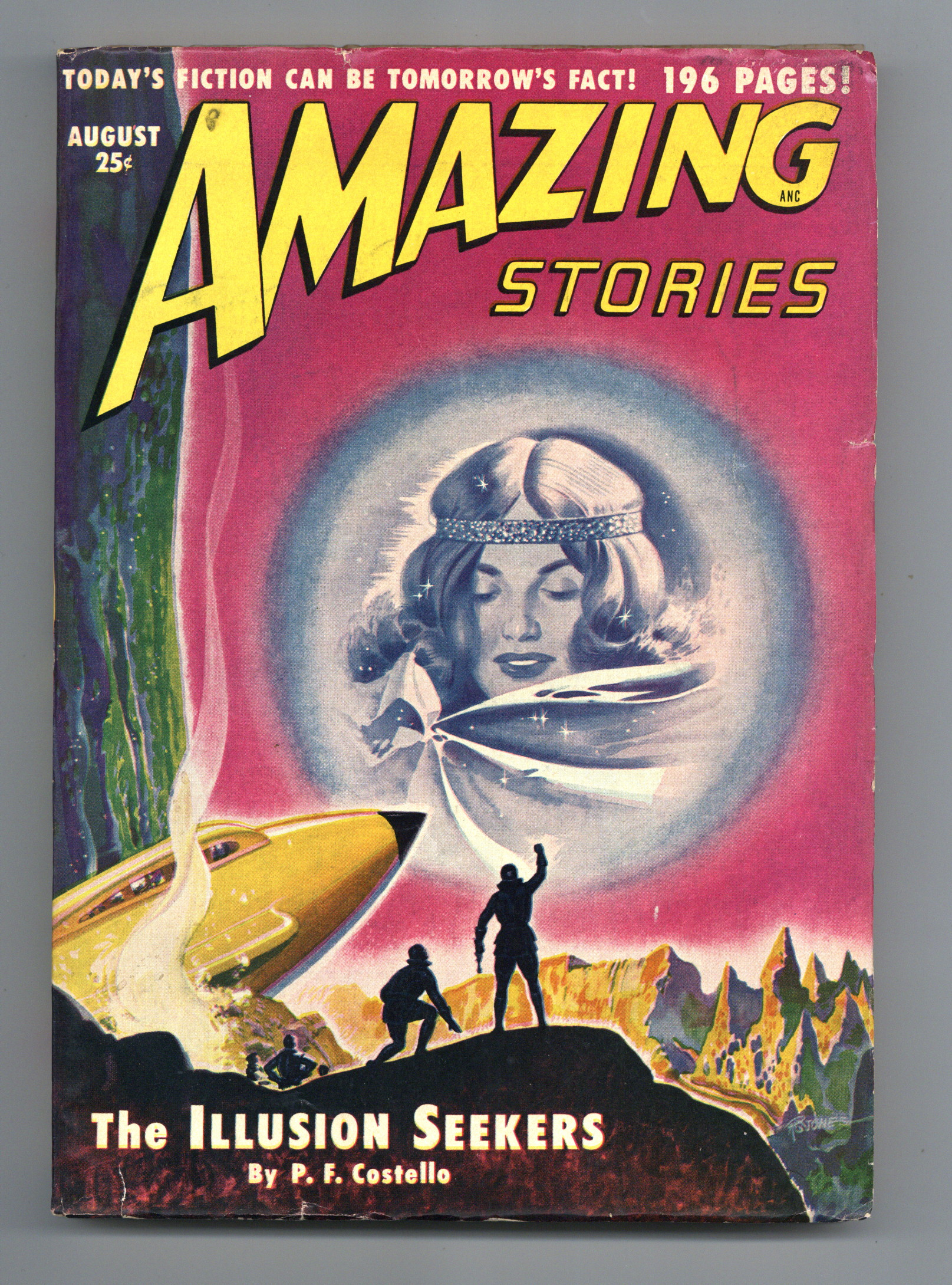 Volume 24, Issue 8 - August, 1950. Cover by Robert Gibson Jones. Science fiction stories by Robert Moore Williams, Fredric Brown "From These Ashes", P.F. Costello "The Illusion Seekers", Franklin Gregory, Russell Branch, Roger Flint Young, and John Bridger. Illustrations by Julian S. Krupa, Leo Ramon Summers, Henry E. Sharp, W.H. Hinton, and Edmond Swiatek. 7-in. x 10-in.; black and white; 196 newsprint pages. Cover price $0.25.