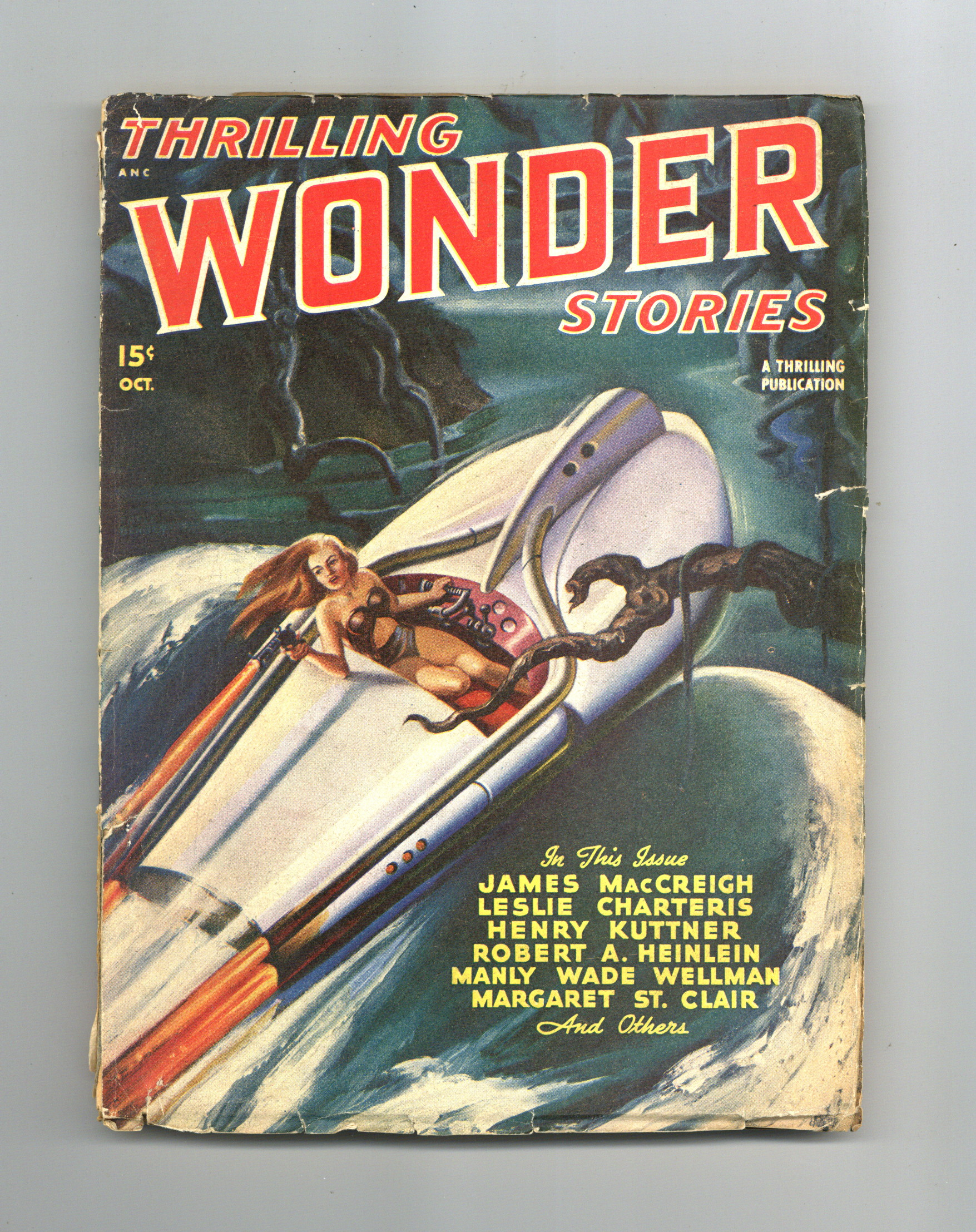 Volume 31, Issue 1 - October, 1947. Cover by Earle K. Bergey. Stories by James MacCreigh, Leslie Charteris, Henry Kuttner, Robert Heinlein, Francis Flagg and Weaver Wright, Manly Wade Wellman, and Margaret St. Clair. Four Virgil Finlay illustrations. 7-in. x 10-in.; black and white; 112 newsprint pages. Cover price $0.15.