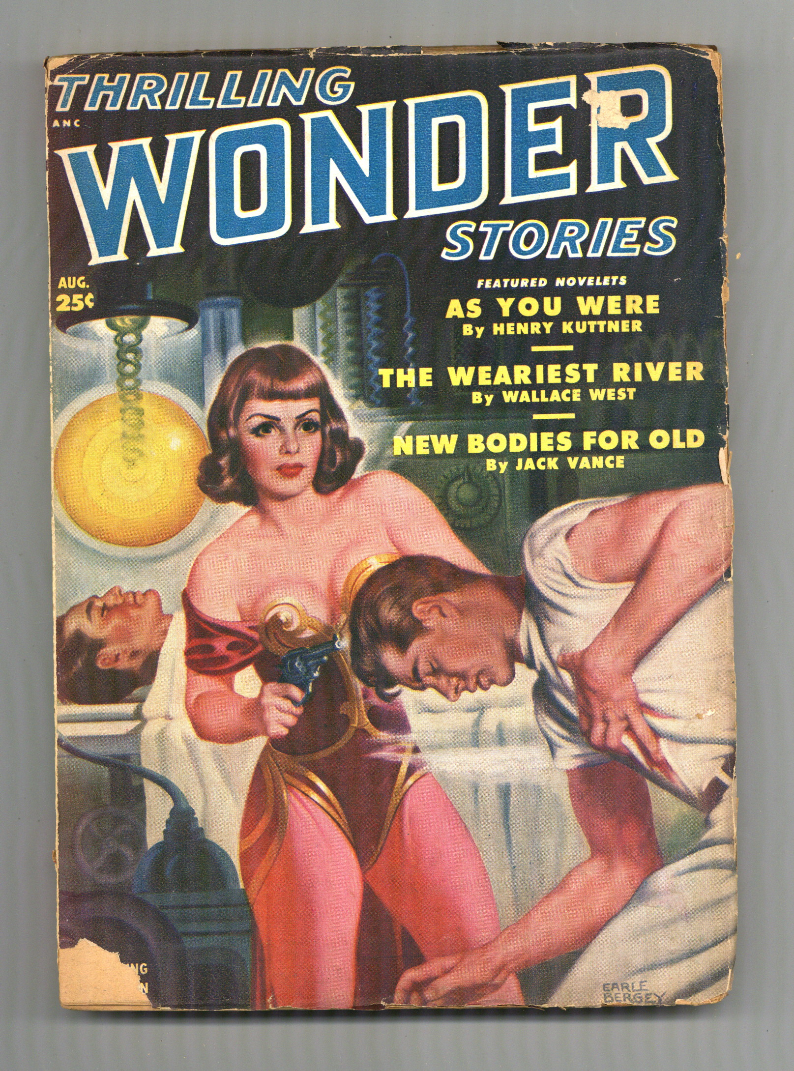 Aug 1950. Cover by Earle K. Bergey. Stories by Henry Kuttner, Wallace West, Jack Vance, Arthur C. Clarke, L. Ron Hubbard, and Walt Sheldon. Four Virgil Finlay illustrations. 7-in. x 10-in.; black and white; 160 newsprint pages. Cover price $0.25.