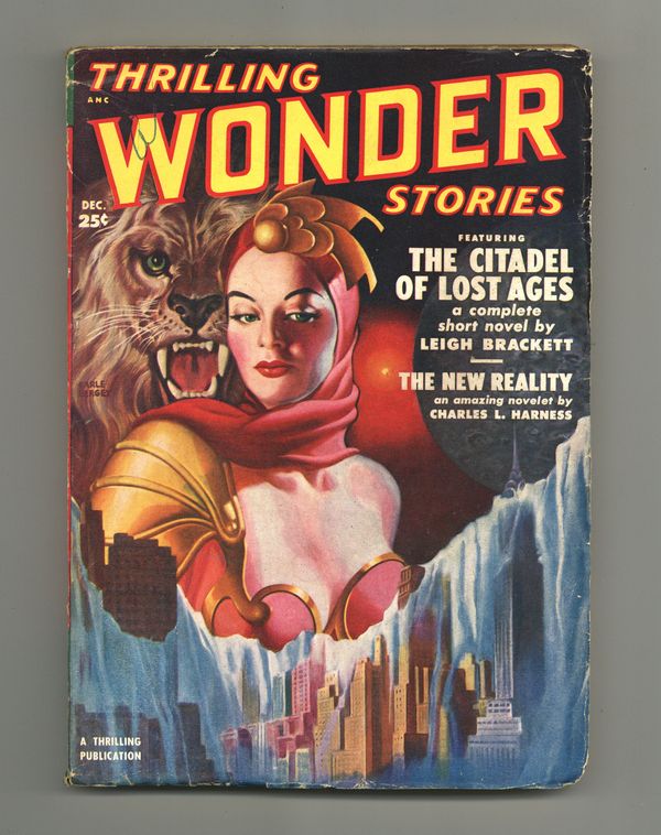 Volume 37, Issue 2 - December 1950. Cover by Earle K. Bergey. Stories: "The Citadel of Lost Ages" by Leigh Brackett, "The New Reality" by Charles L. Harness, "Captain Famine" by Cleve Cartmill, "The Everlasting Food" by Margaret St. Clair, "MacHINERY" by Eric Frank Russell, "The Spark" by Mack Reynolds, "Chore for a Spaceman" by Walt Sheldon, "If You Don't Watch Out" by Frank Belknap Long, "Bluff Play" by Raymond Z. Gallun. Softcover Pulp, 7-in x 10-in, 162 Pages, B&W. Cover price $0.25.