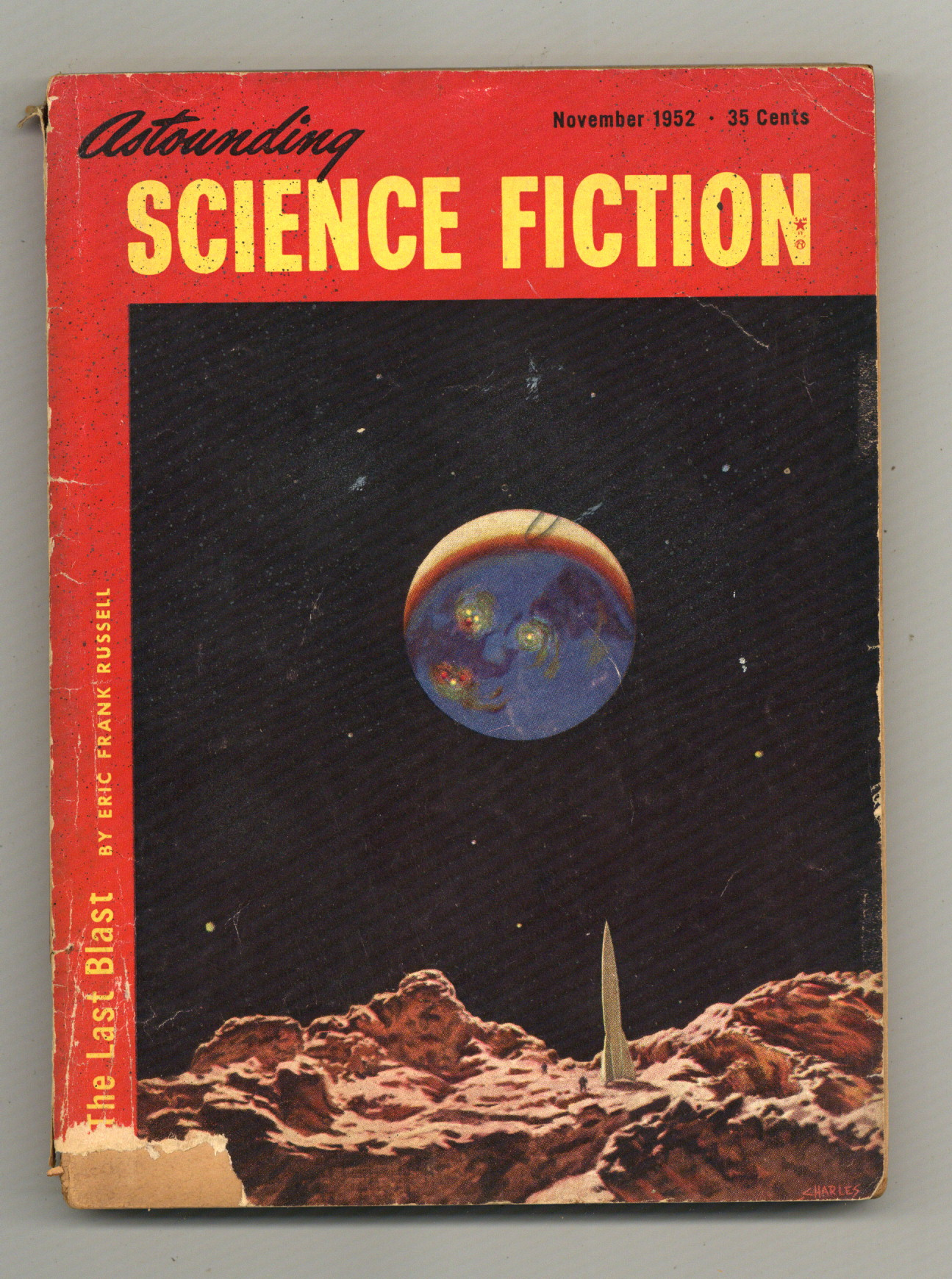 Published Nov 1952 by Street & Smith.$2.70Nov 1952. Volume 50, Issue 3 - 1st printing. Cover by Schneeman. Science fiction stories by Eric Frank Russell, Algis Budrys, Ralph Williams, Gene L. Henderson, and Isaac Asimov ("The Currents of Space" part 2). Illustrations by Orban, Pawelka, and van Dongen. Article on oil. Softcover, 5.5-in. x 7.75-in.; 172 newsprint pages, B&W. Cover price $0.35.