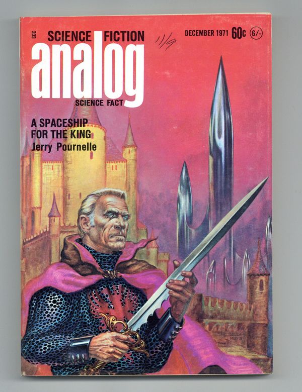 Published Dec 1971 by Dell Magazines.$2.65December 1971. Cover by Kelly Freas. Stories: "A Spaceship for the King" (part 1 of 3) by Jerry Pournelle, "Foundlings Father" by Jack Wodhams, "Just Peace" by William Rupp and Vernor Vinge, "The Incompetent" by Chris Butler, "Ecology Now!" by Wade Curtis, and "Priorities" by Ben Bova. Science Fact article, "A Matter of Perspective" by Gordon R. Dickson and Kelly Freas. Illustrations by Kelly Freas and Leo Summers. Softcover, 5.5-in. x 7.5-in.; 178 newsprint pages, B&W. Cover price $0.60.