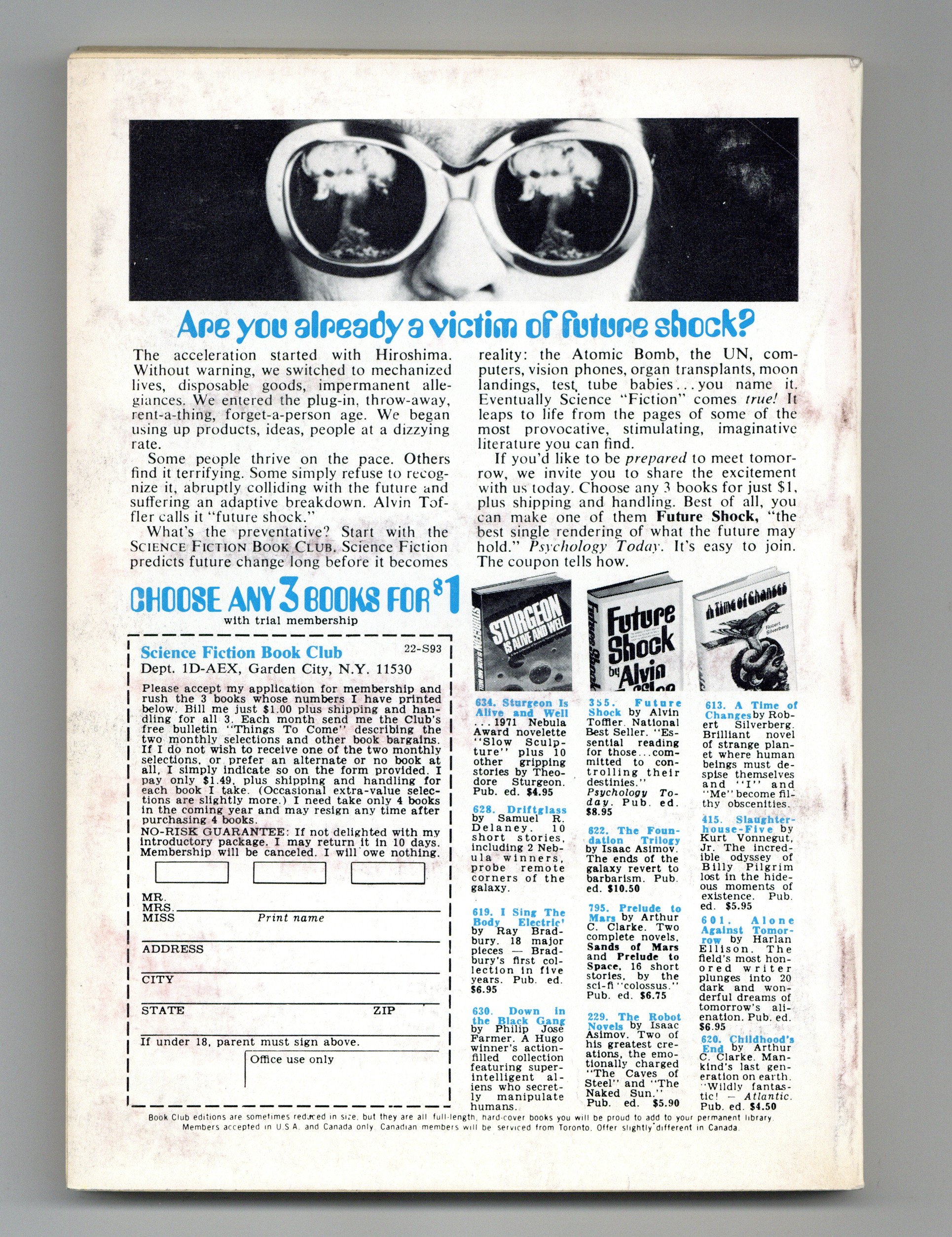 December 1971. Cover by Kelly Freas. Stories: "A Spaceship for the King" (part 1 of 3) by Jerry Pournelle, "Foundlings Father" by Jack Wodhams, "Just Peace" by William Rupp and Vernor Vinge, "The Incompetent" by Chris Butler, "Ecology Now!" by Wade Curtis, and "Priorities" by Ben Bova. Science Fact article, "A Matter of Perspective" by Gordon R. Dickson and Kelly Freas. Illustrations by Kelly Freas and Leo Summers. Softcover, 5.5-in. x 7.5-in.; 178 newsprint pages, B&W. Cover price $0.60.