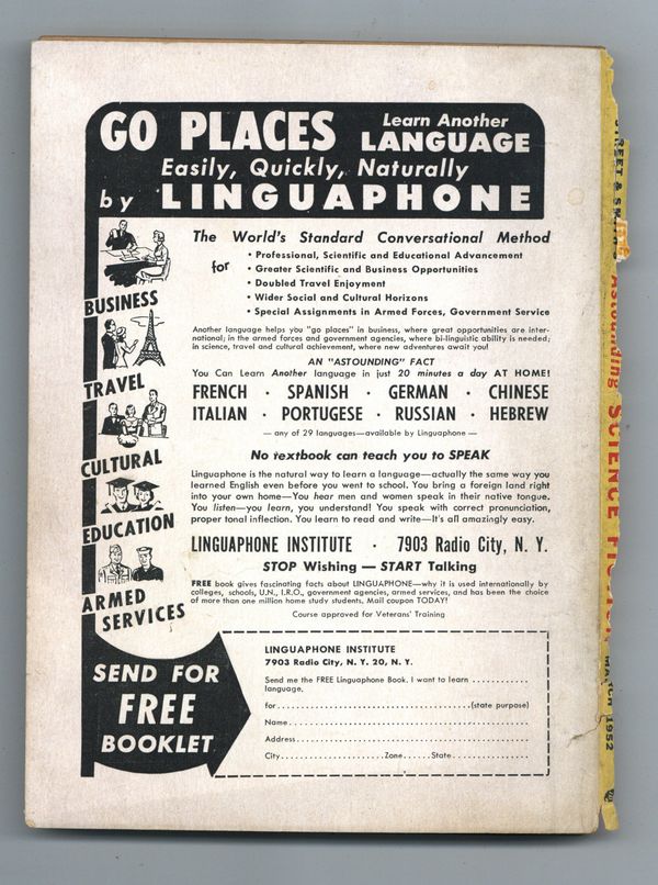 Published Mar 1952 by Street & Smith.$2.65- Front cover detached 90%. Back cover detached 90%. Front and Back Cover Detached.