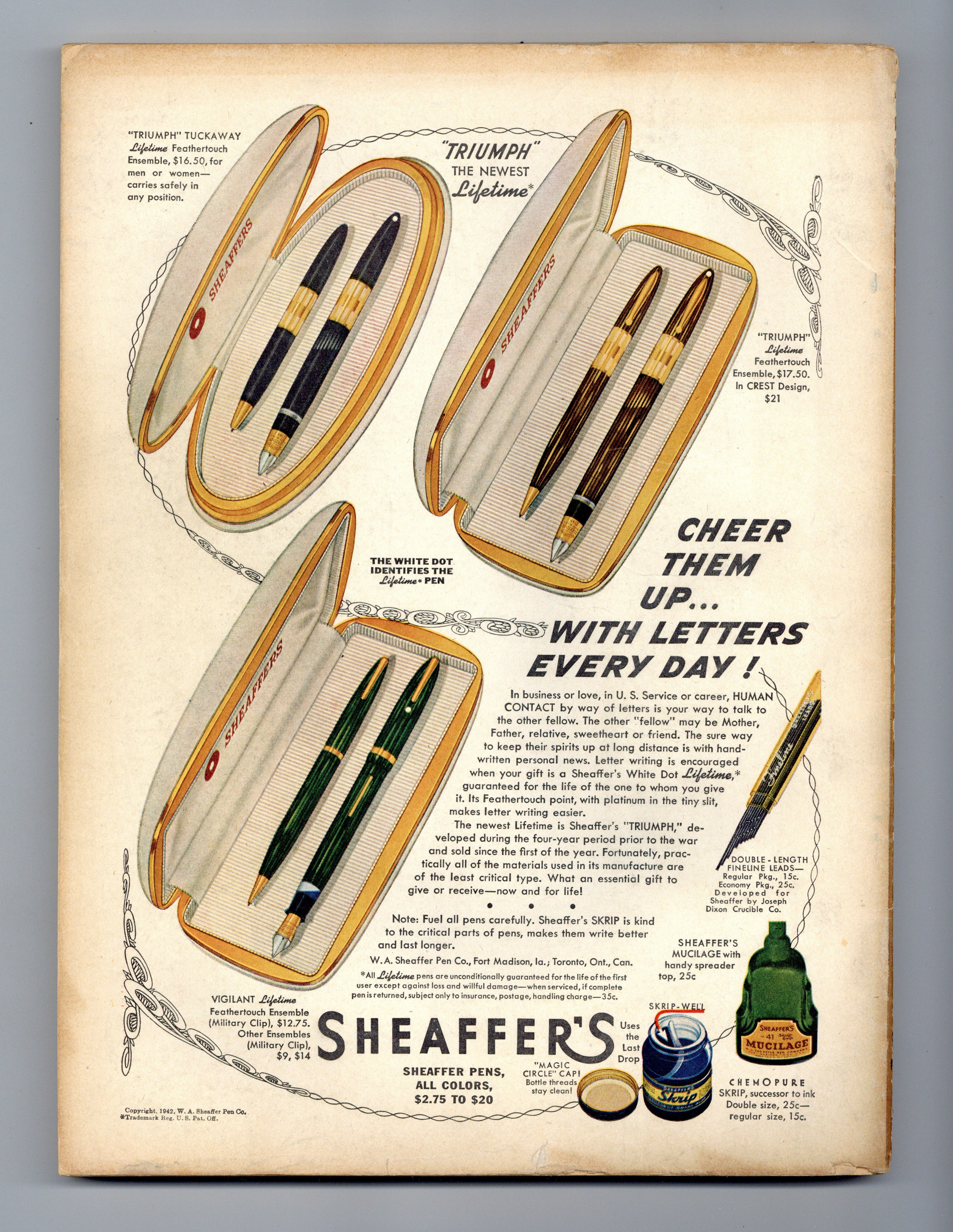 Published Dec 1942 by Street & Smith.$22.00- Front cover detached 40%. Back cover detached 10%. Water damage: Slight. Staple rust: Slight.