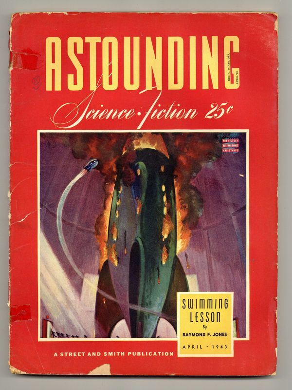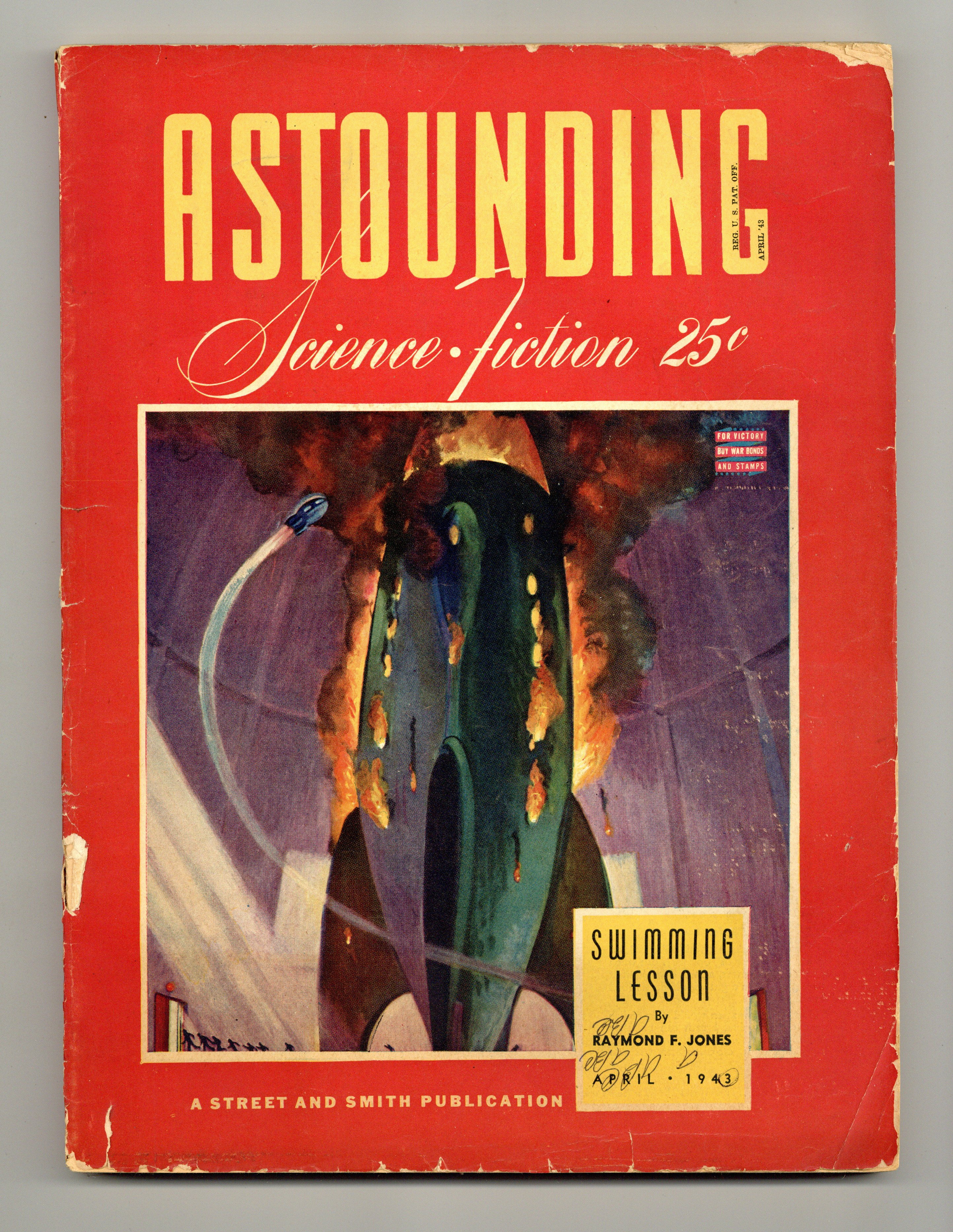 April, 1943. Volume 31, Issue 2. Last bedsheet format (returns to trimmed pulp next issue). Cover by William Timmins. "Swimming Lesson" by Raymond F. Jones and "The Weapon Makers" part 3 of 3 by Frank Kramer. Other science fiction stories by Henry Kuttner, C. L. Moore (as Lewis Padgett), Joseph Gilbert, Fred W. Fischer, A. E. van Vogt, E. Mayne Hull, & Nelson S. Bond. Interior illustrations by Paul Orban, Elton Fax, M. Isip, and Frank Kramer. Bedsheet format, 8.5-in. x 11.5-in.; black and white; 130 newsprint pages. Cover price $0.25.